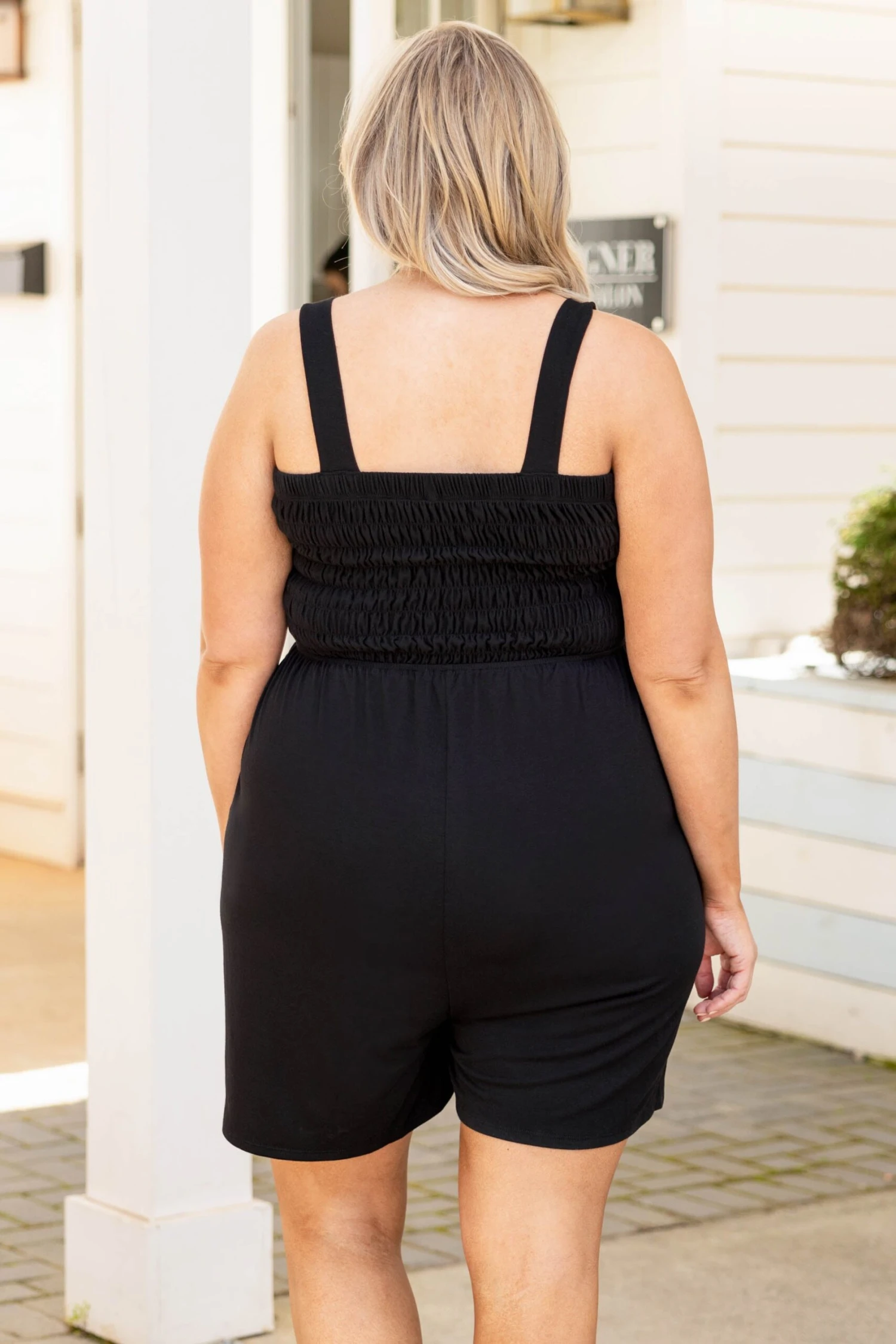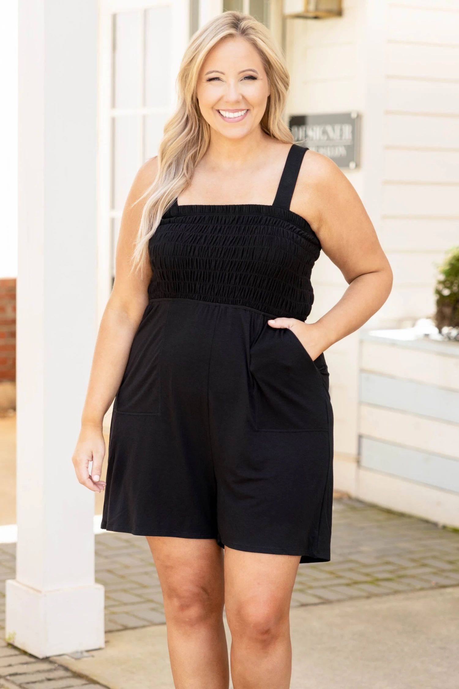 Many adventures lie ahead with this romper! The black color is so chic and the smocked bodice ensures the perfect fit! We love the stretchy material and the fact that it has pockets! Style this with sandals and gold accessories to make a statement!