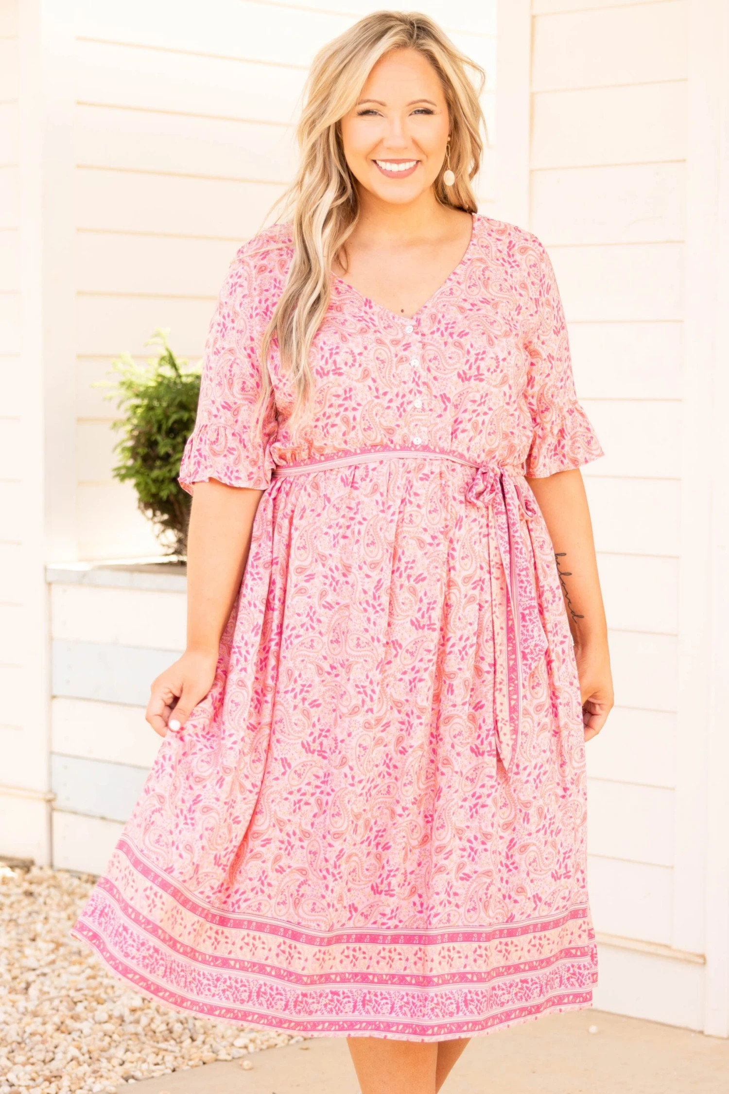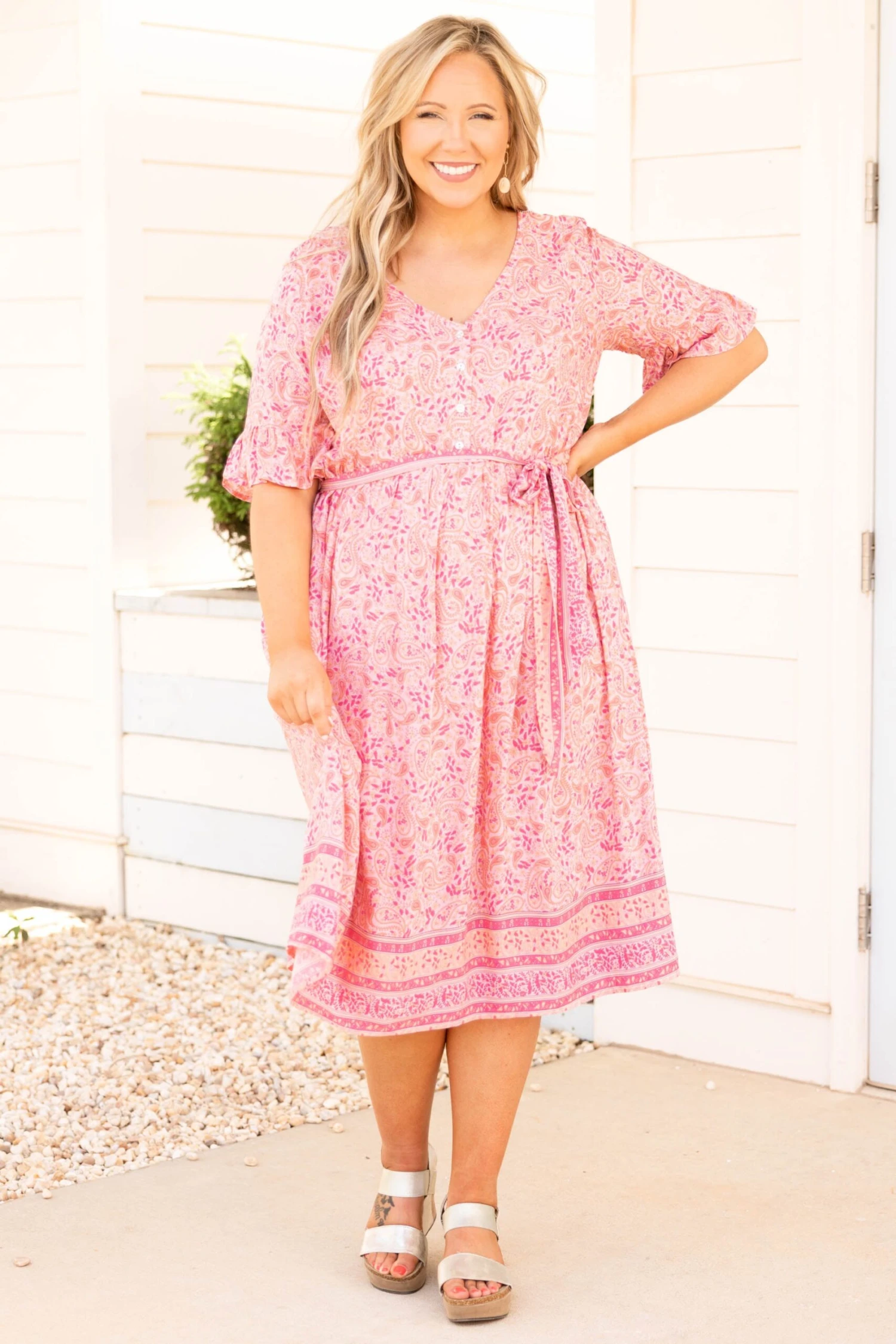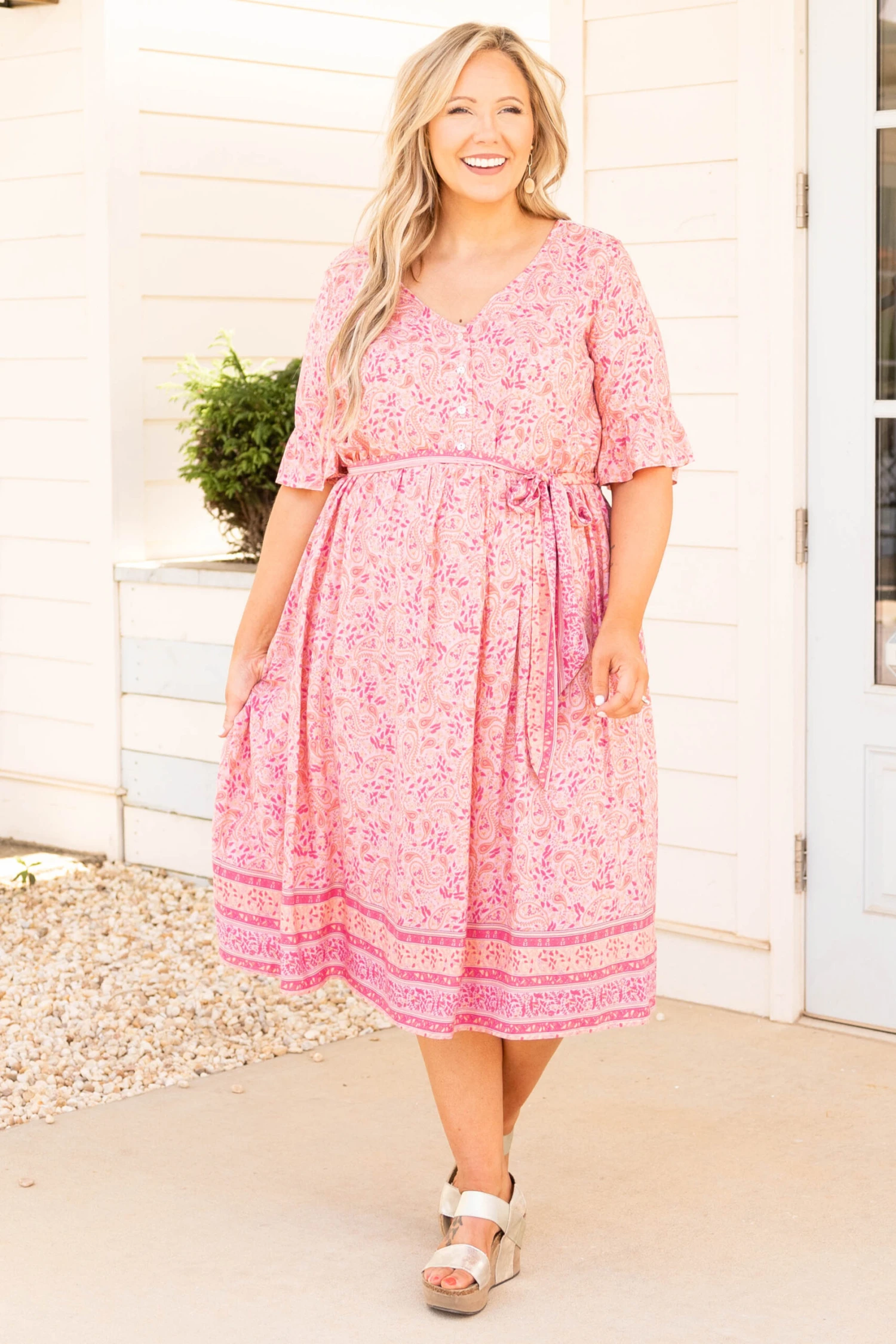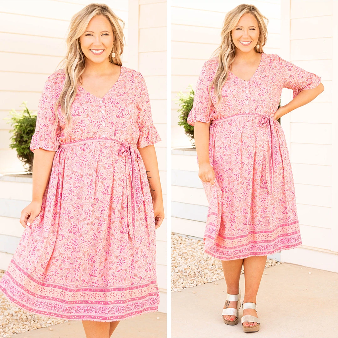 This dress gives off major angel energy! The pink color is so bright and fun and the midi length is so trendy! We love the sweet floral pattern and the buttons down the front that give this a feminine feel! Style it with some fun accessories and wedges or heels for a great look!