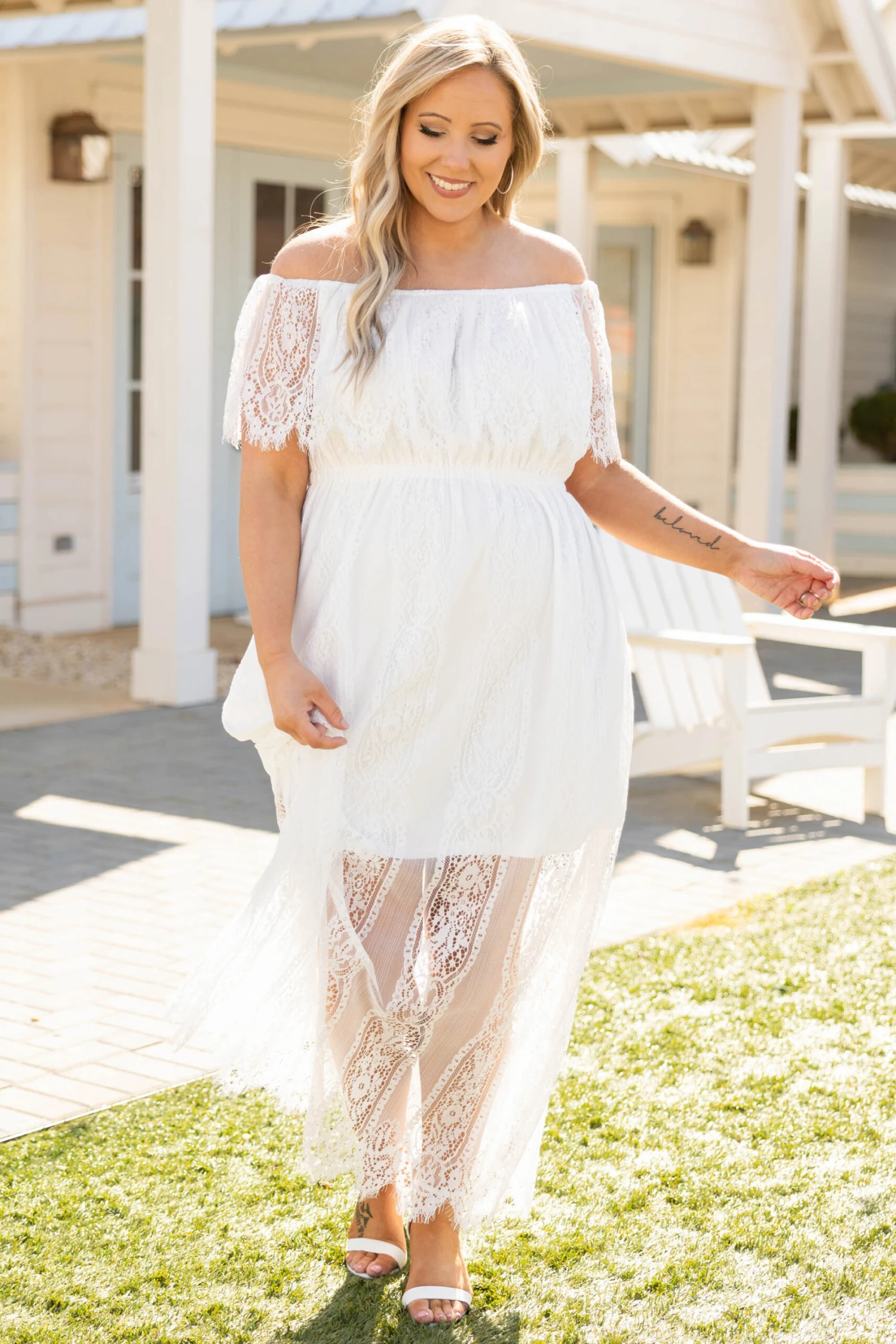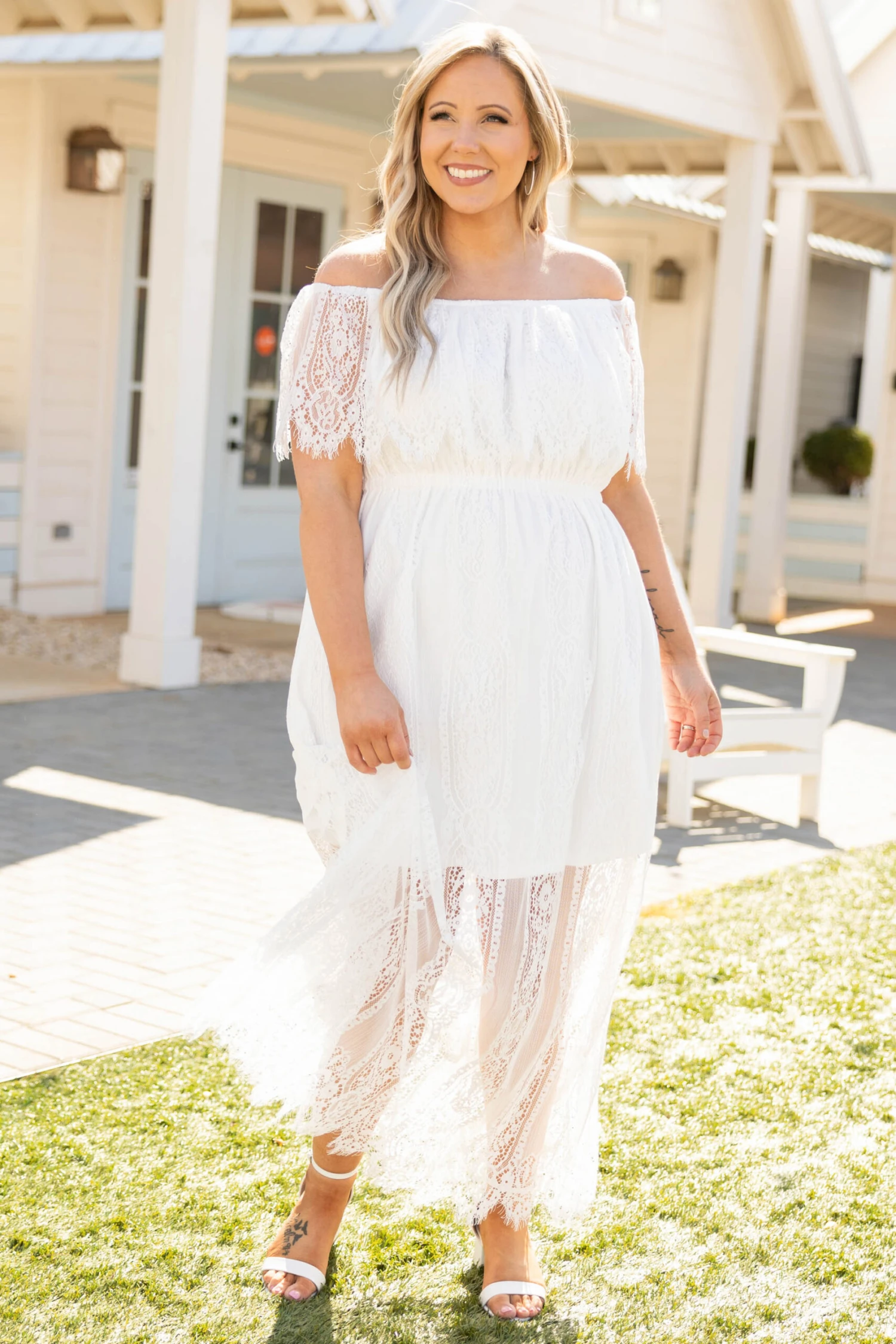 Channel your angelic soul in this cute dress! The lace look is so sweet and the off the shoulder neckline is super flirty! This cutie has a solid white color that is so fun to pair with some bold accessories or your fave shoes for a look that is perfectly angelic!
