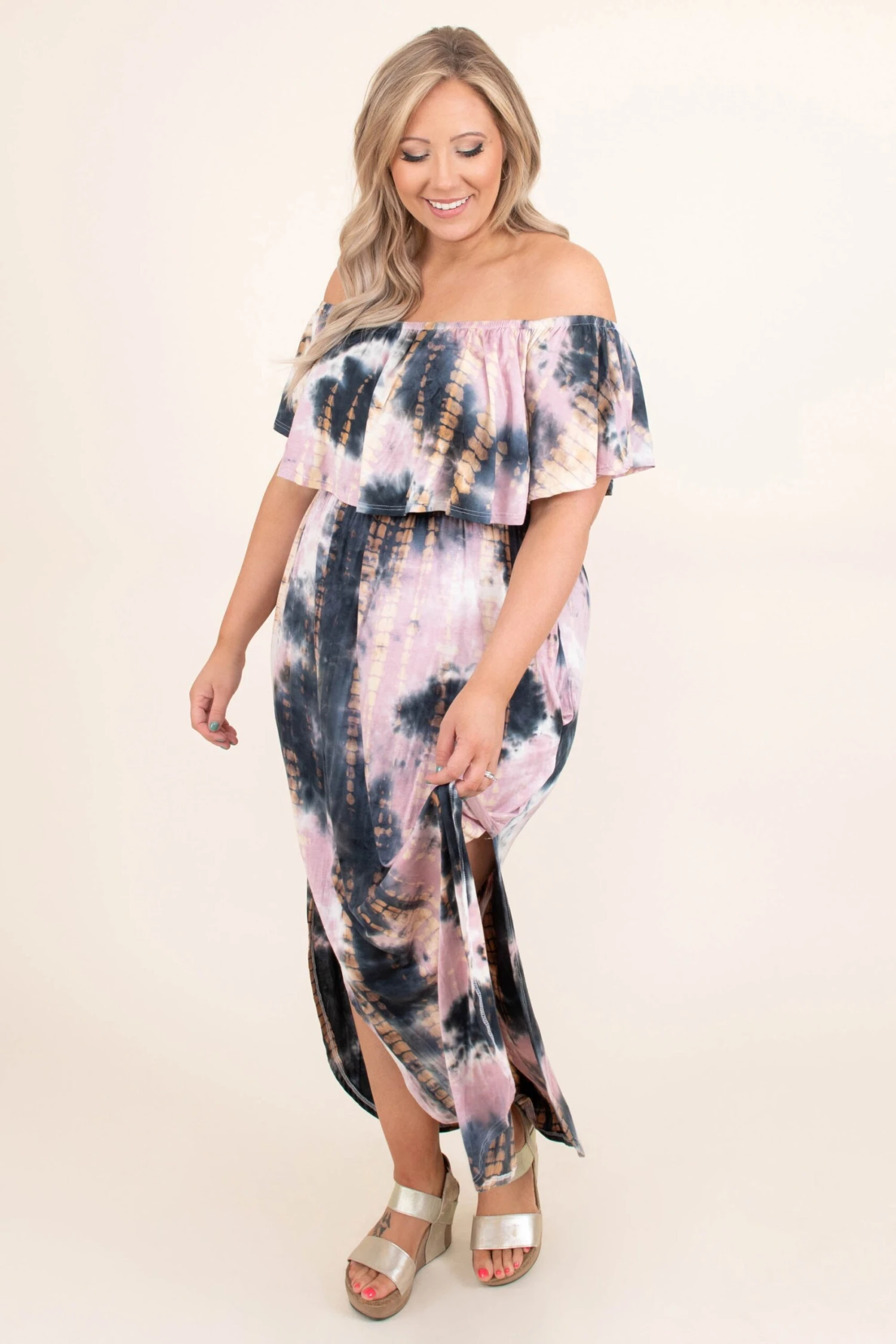 This beachy beauty is perfect for just about any occasion! This one is just as cute as it is comfy! The fabric is super soft and stretchy and creates an ultra loose, forgiving fit. It features pockets and a split side seams for the ultimate look! But, our favorite part is that elastic ruffled off-the-shoulder neckline! It’s so fun and trendy!