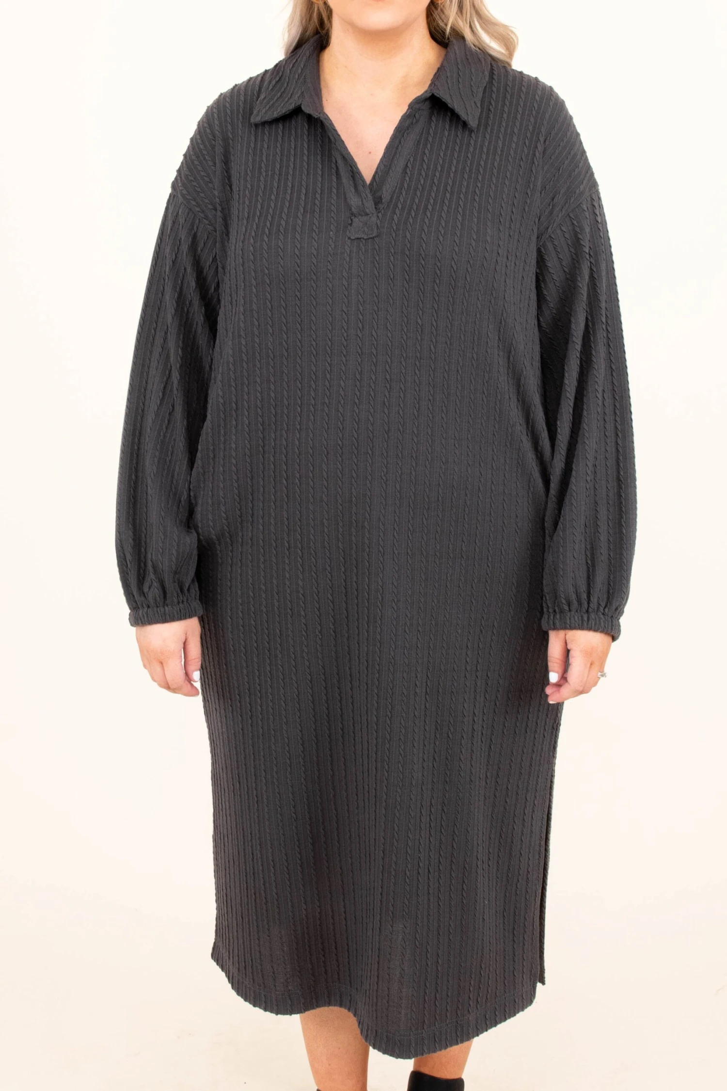 You will definitely feel chilled out when you are wearing this super comfy midi! The knit texture fabric is so comfy and the gray color can be matched with anything! The collared neckline is so trendy and the pockets on the side are an amazing added bonus!