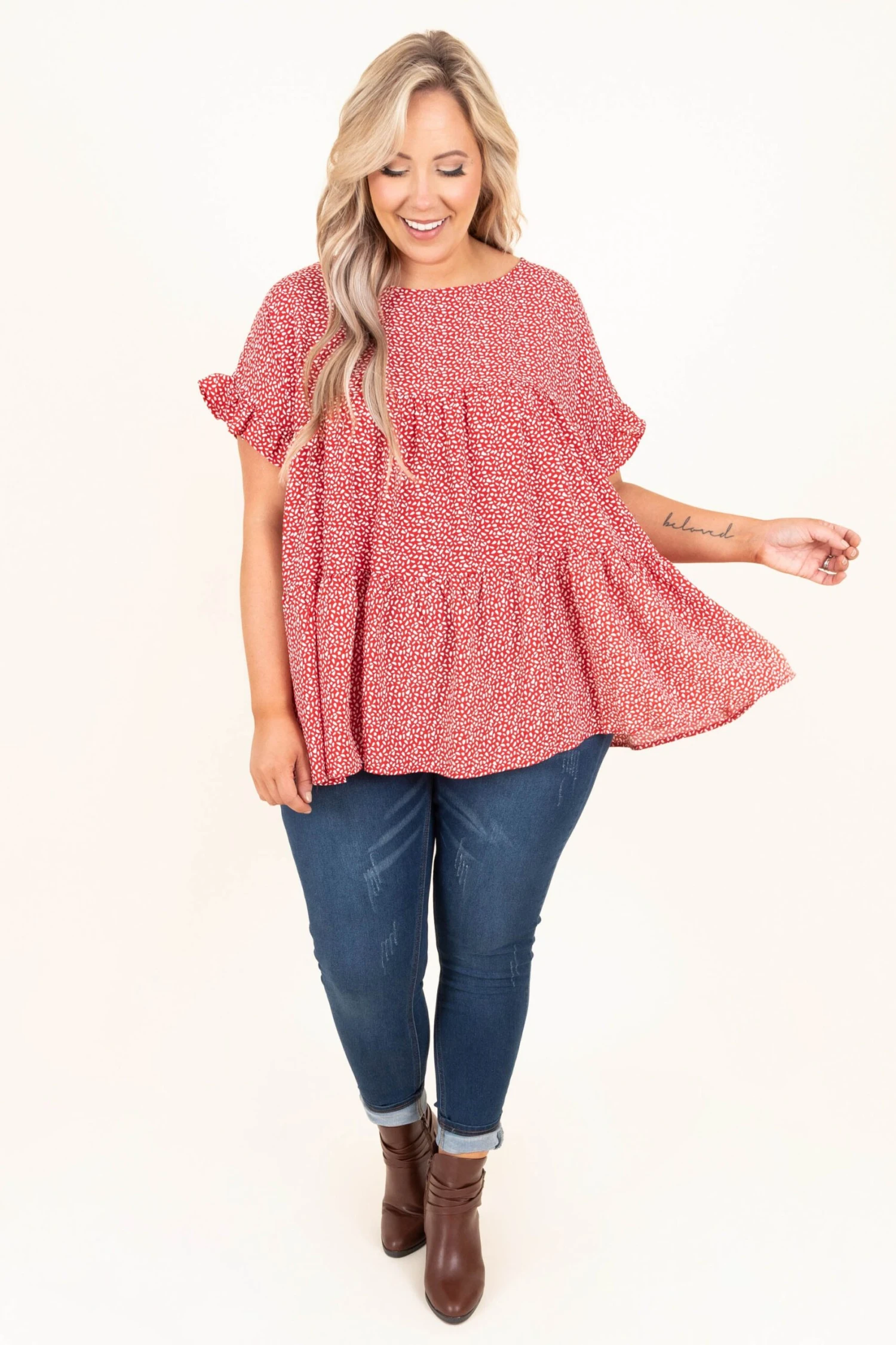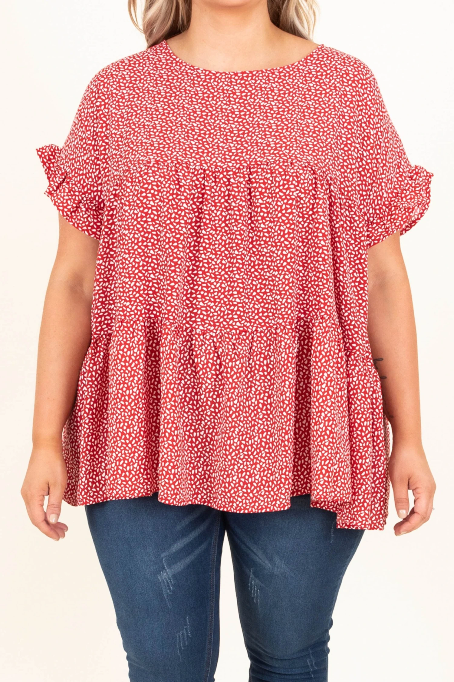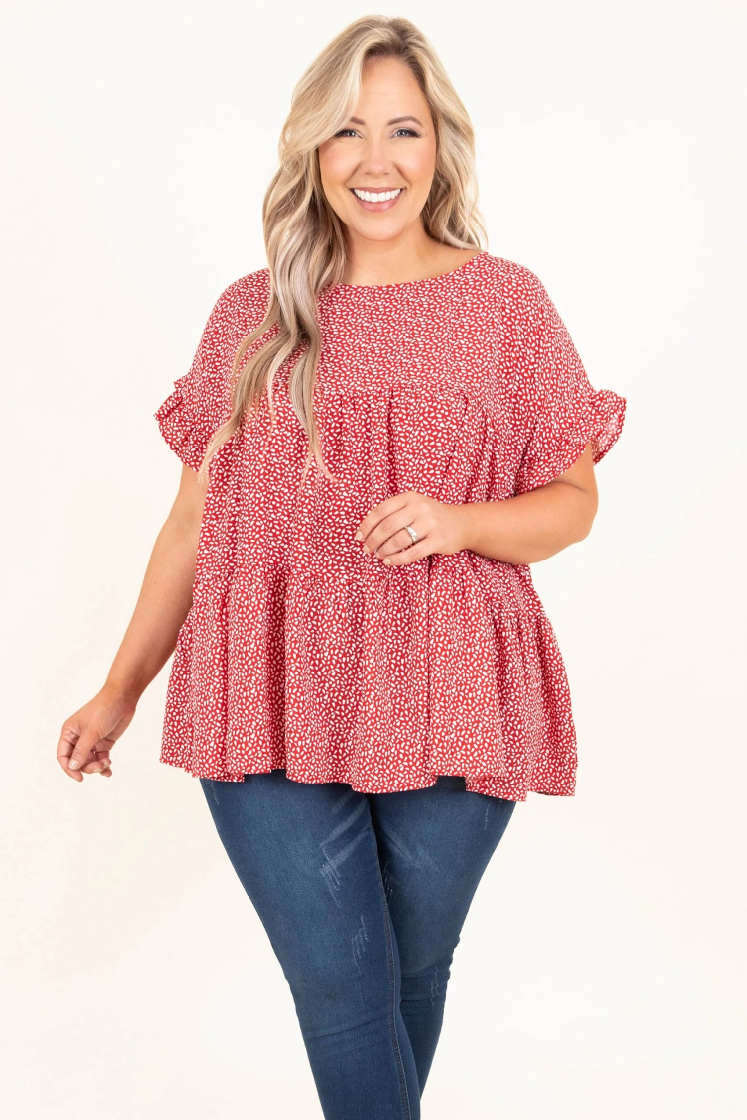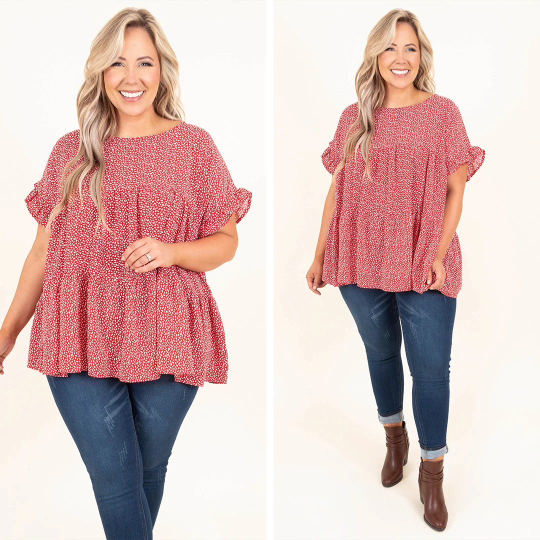 Grabbing coffee with the girls? This top is perfect! This top has a trendy polka dot pattern with aย red color that is perfectly chic! It’s comfortable for all-day wear, has a flowy fit, and features the cutest baby doll design! Style this top with skinnies and booties for an effortlessly chic look!ย