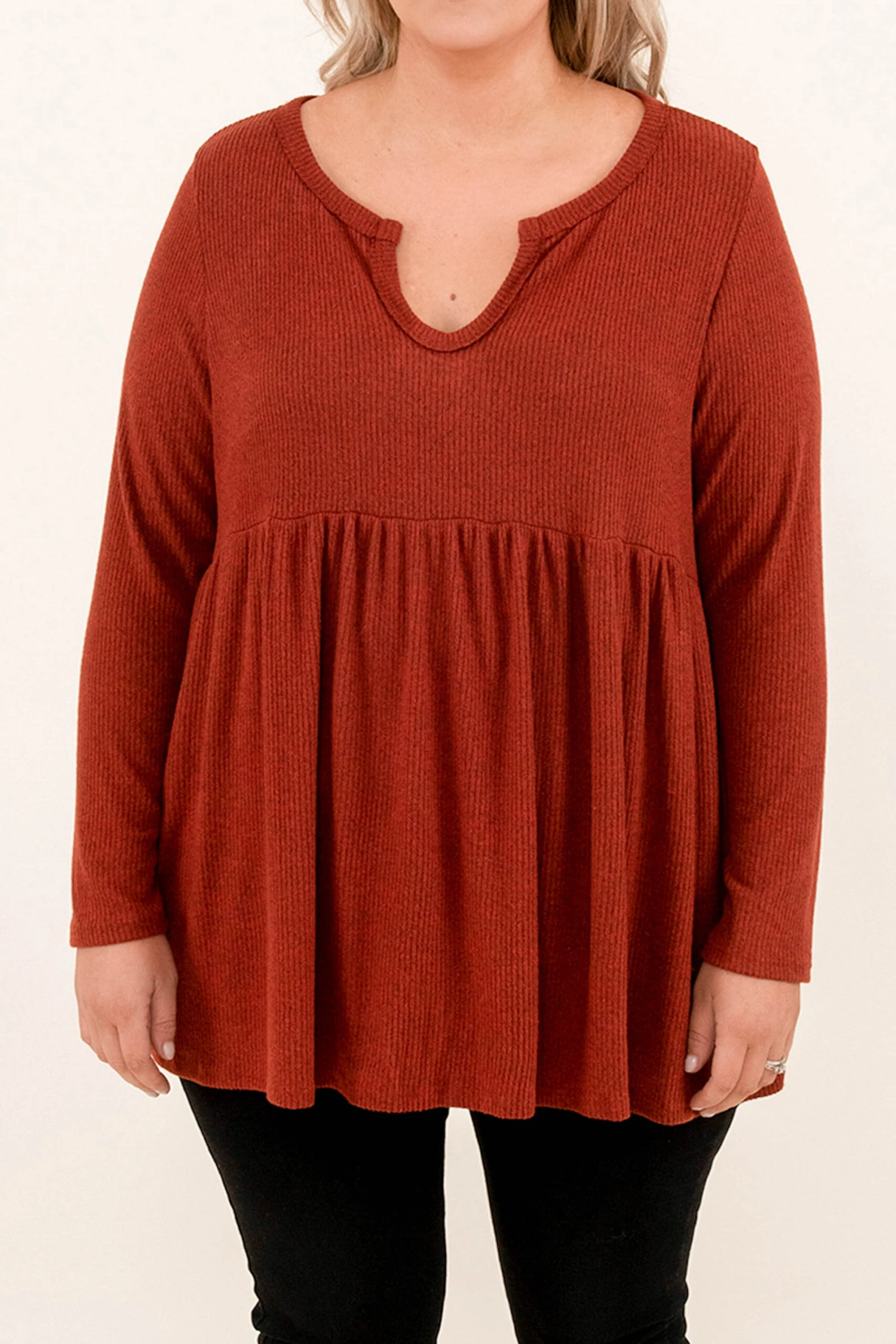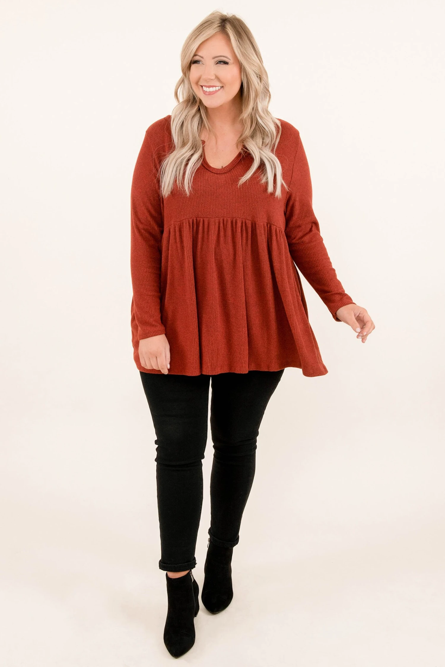 You will feel so confident rocking this babydoll top! It has a cool scoop in the neckline, a fun brick color and is so comfy. Style this with black jeans and booties for a chic look!
