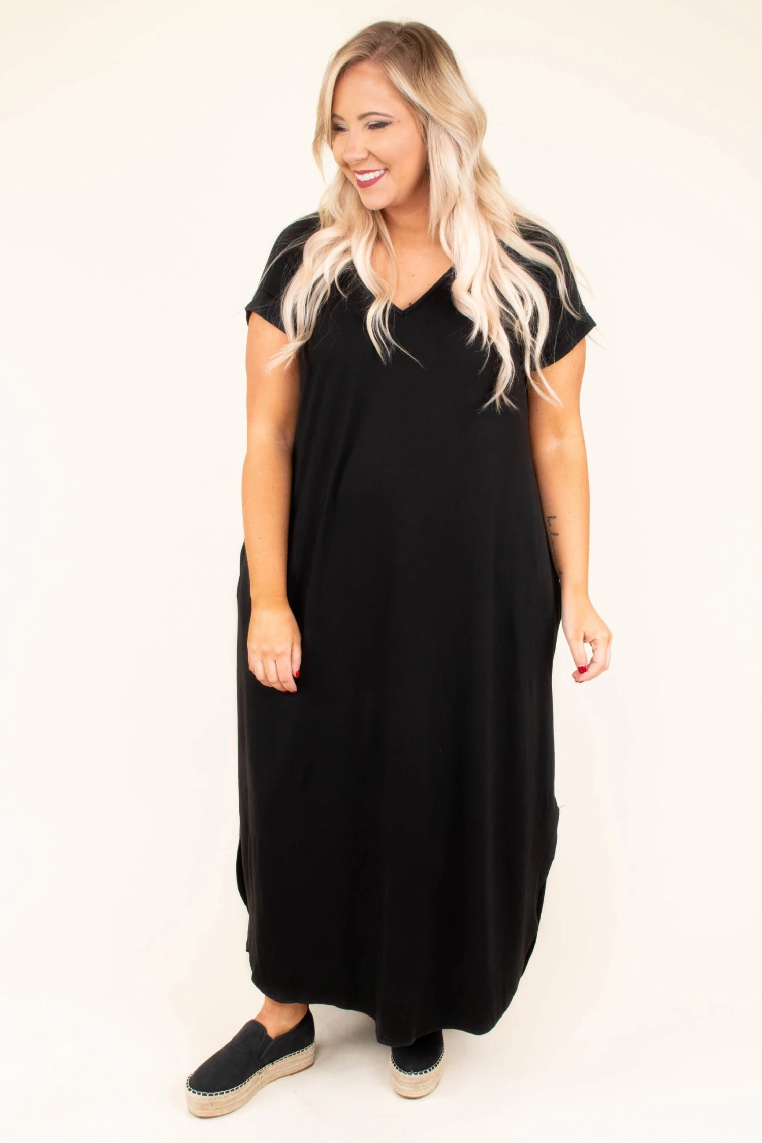 Coming to a fashion crossroad? Go in whichever direction includes this dress! This beautiful black dress is the basic piece your closet needs! It has a solid color you can dress up or down and style with your favorite accessories! It’s comfortable for all day wear and has a trendy asymmetrical hemline for ultimate style! Wear this dress with sandals or booties for your next event!