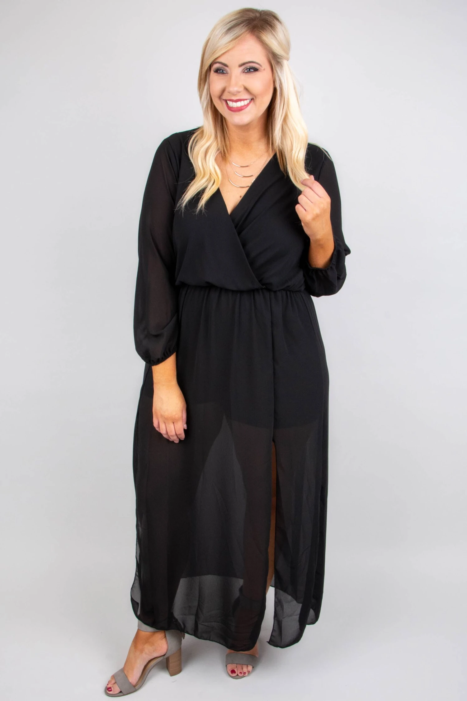 This is the perfect dress for a dreamy date night! It has a sleek black color and a super flattering fit! The flirty, flowy fabric is so light and breezy you’ll love wearing it! Not to mention how functional the built in shorts are! Style it with heels and chic jewelry to complete the look!