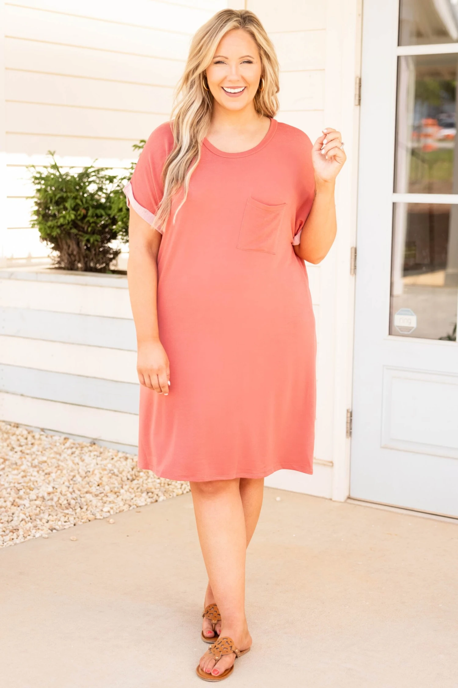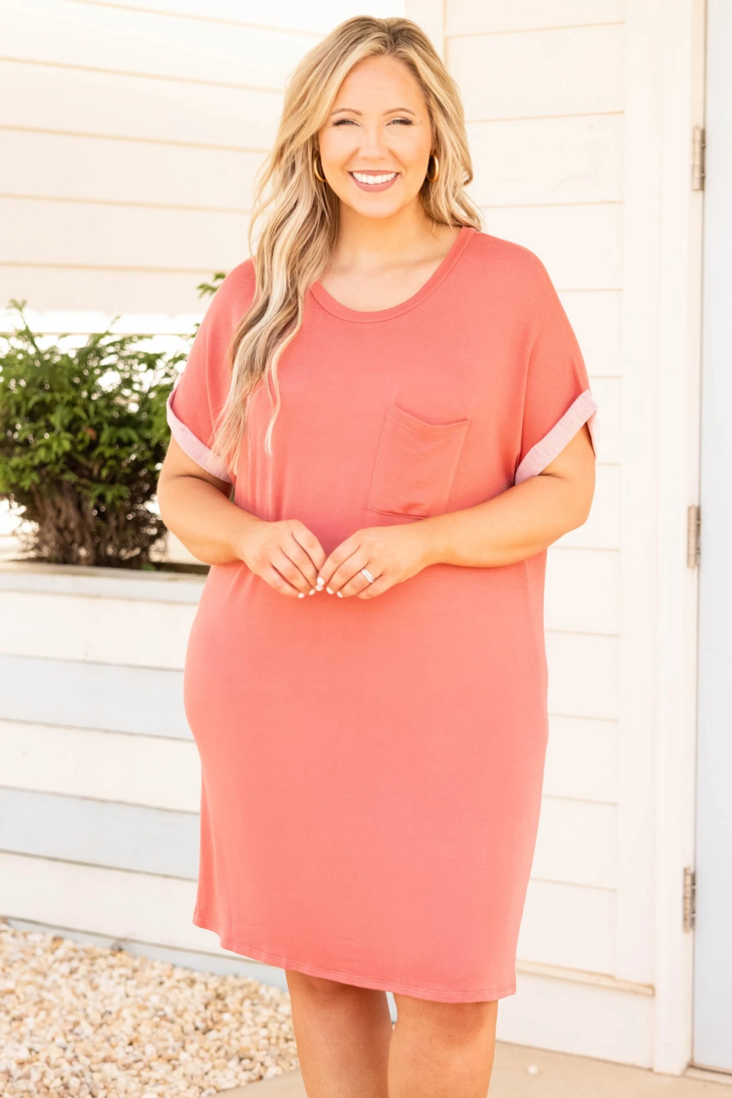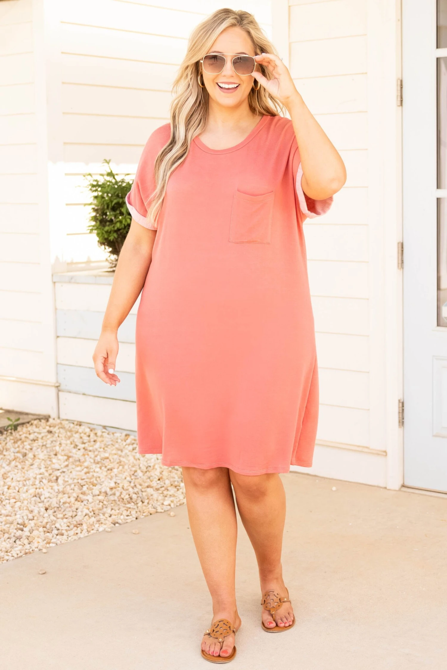 This dress is perfect for the weekend! It has a bold coral neutral color you can dress up or down for every occasion! It’s comfortable for all-day wear, has a figure-flattering fit, and features the cutest tank top style sleeves! Style this dress with sandals or heels for your next event! Â