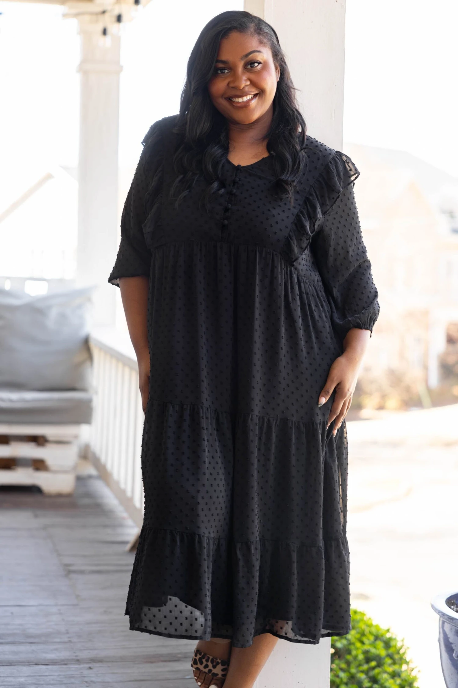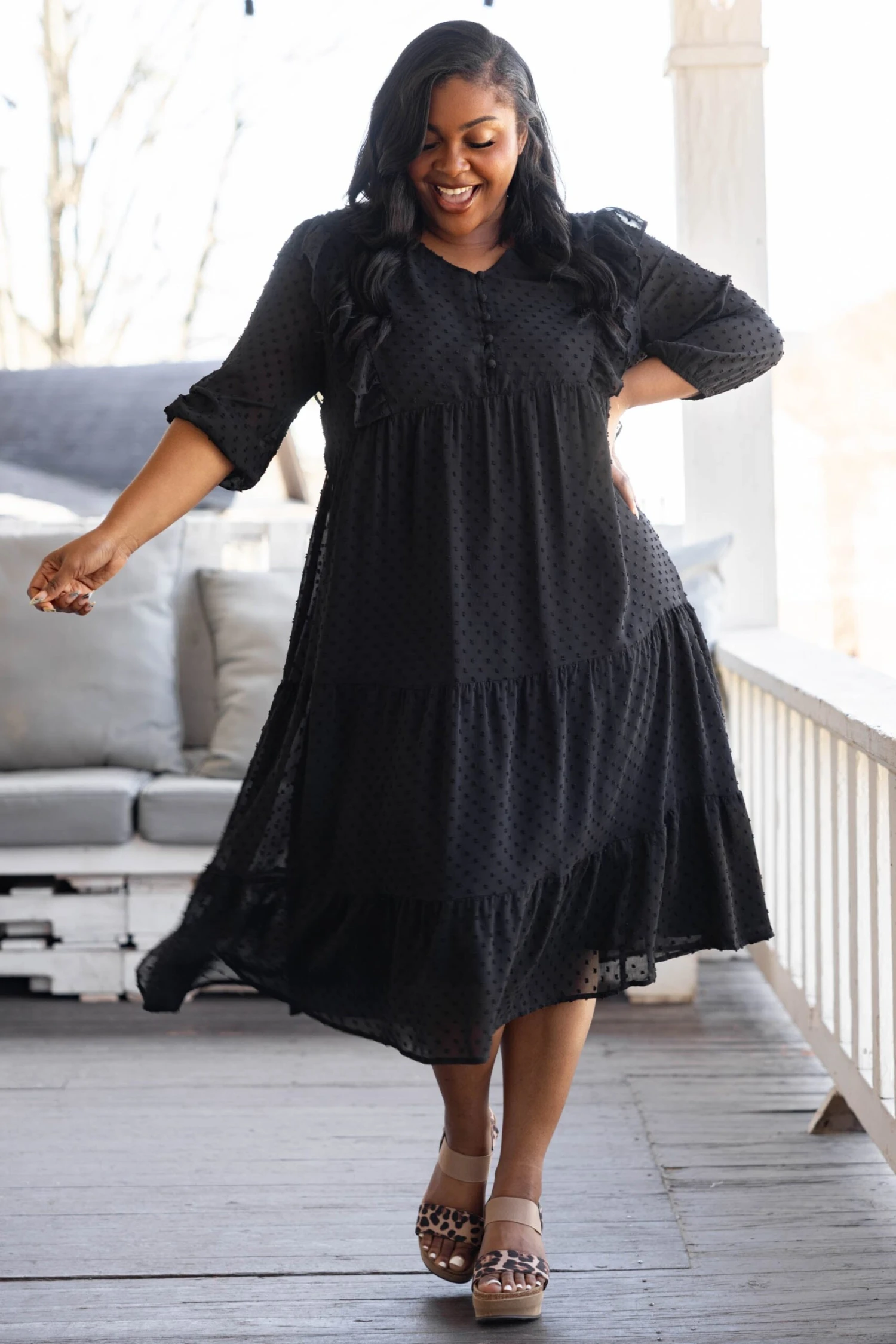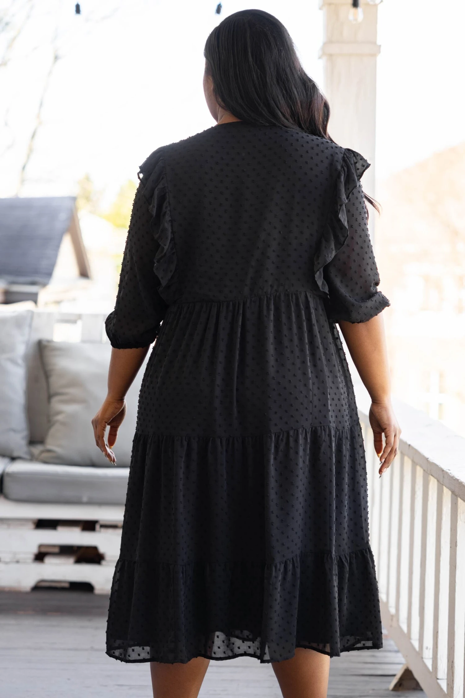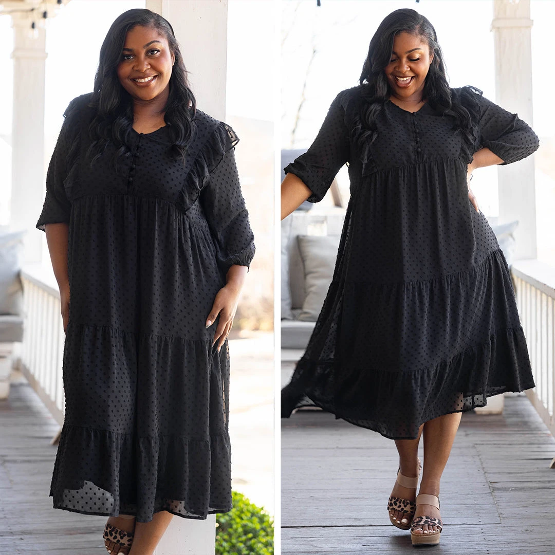 This dress is a total dream! It has a neutral black color with a raised polka dot pattern that is a season favorite! The midi length and flowy style makes this the perfect go-to dress for the season! Style this dress with wedges and cute accessories for a classy chic look!