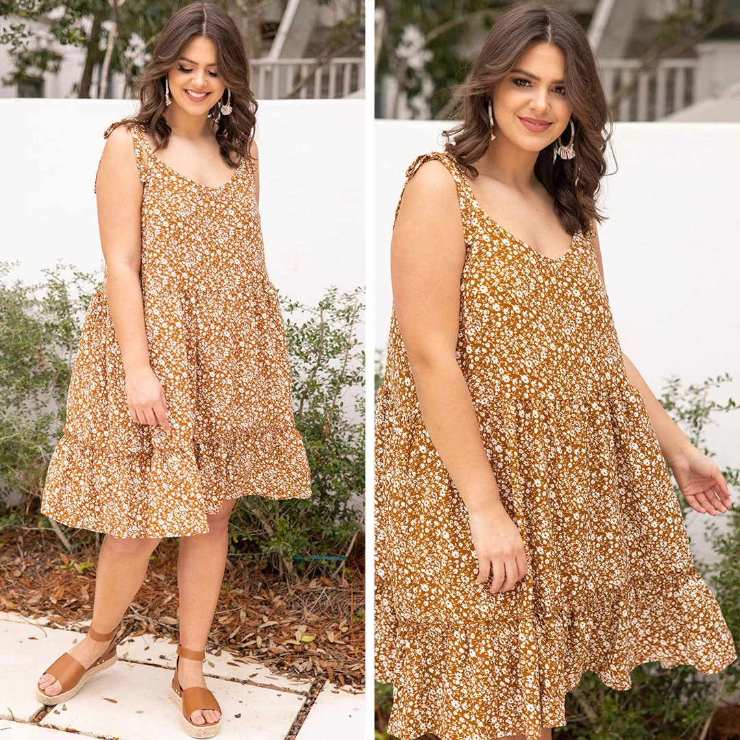 Shine bright with or without the sun in this dress! This dress has a trendy floral print with neutral colors you can style for every occasion! It’s comfortable for all-day wear, has a figure-flattering fit, and features the cutest ruffled details! Style this dress with sandals or wedges for an effortlessly chic look!Â