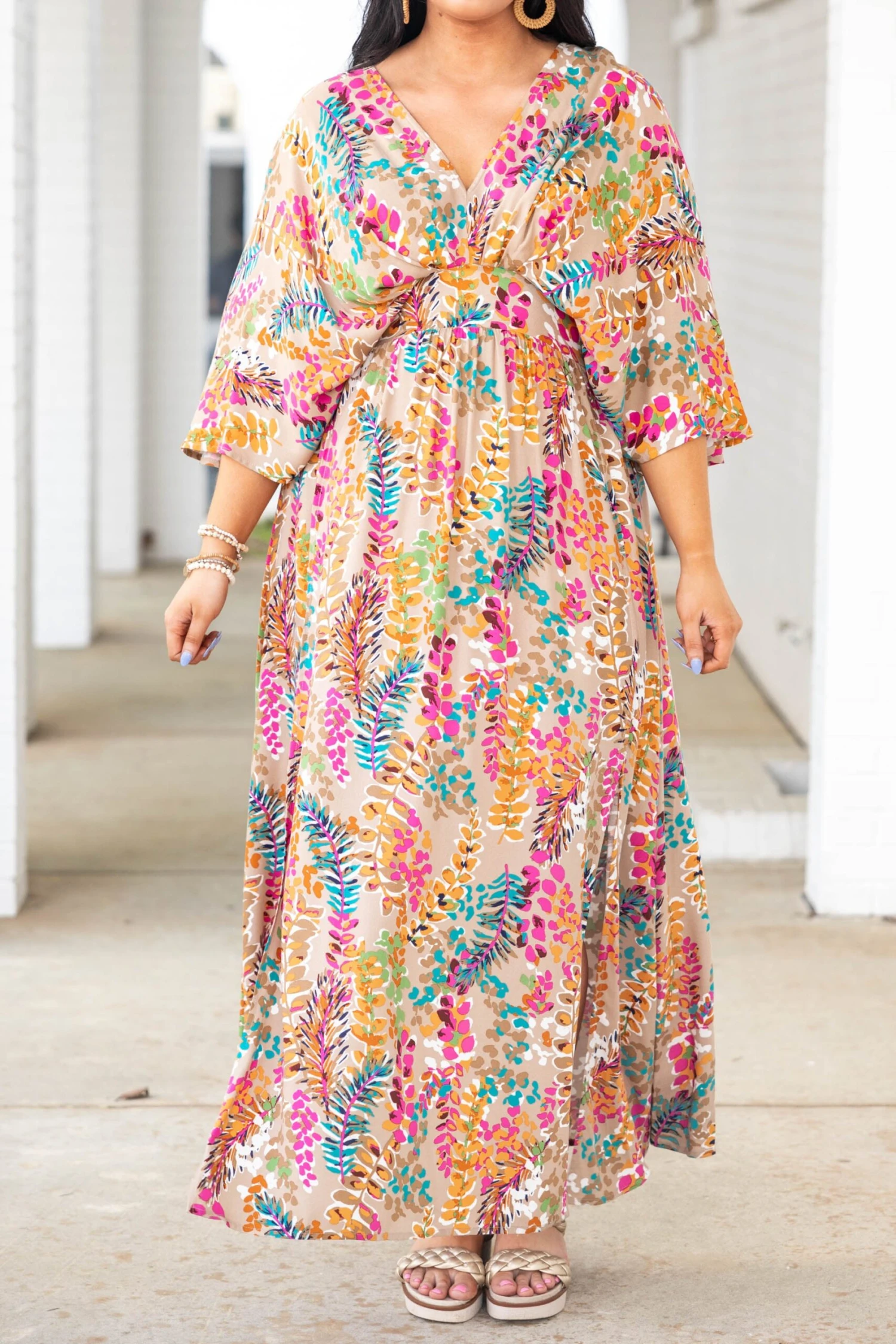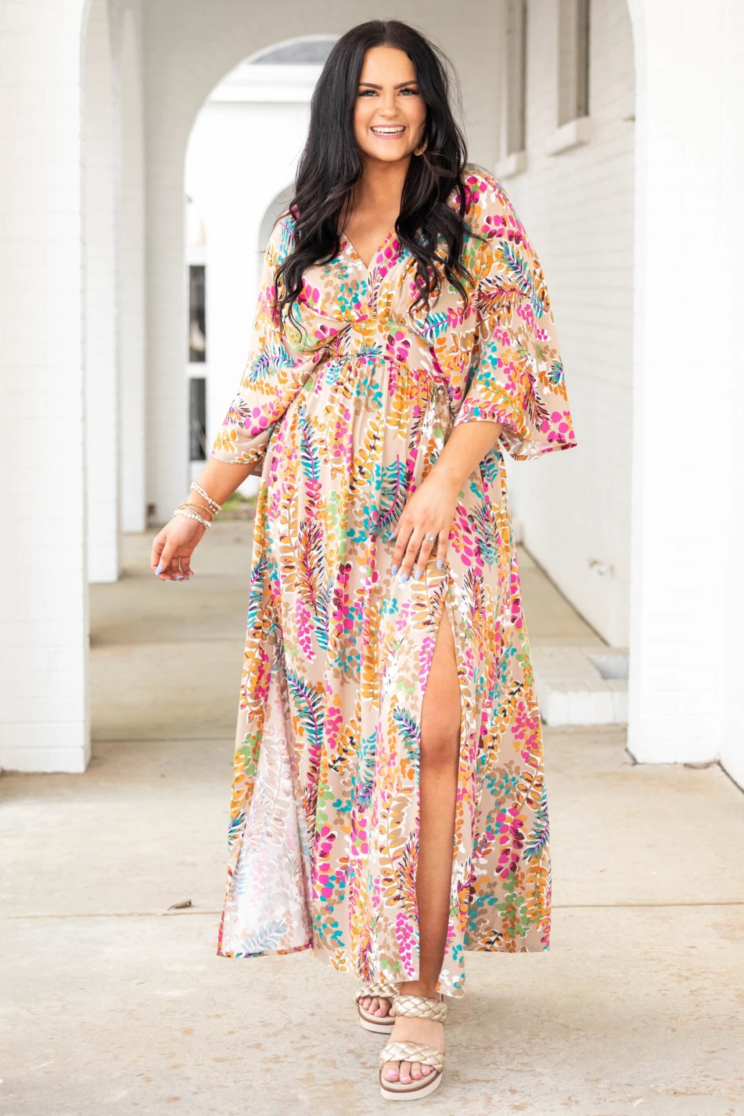 Go with the flow and add this beauty to your wardrobe! This dazzling maxi has a beautiful color combo that is a must-have for the season! The flowy, flattering fit and flirty front splits are gorgeous! Style this dress with heels or sandals for an unforgettable chic look!