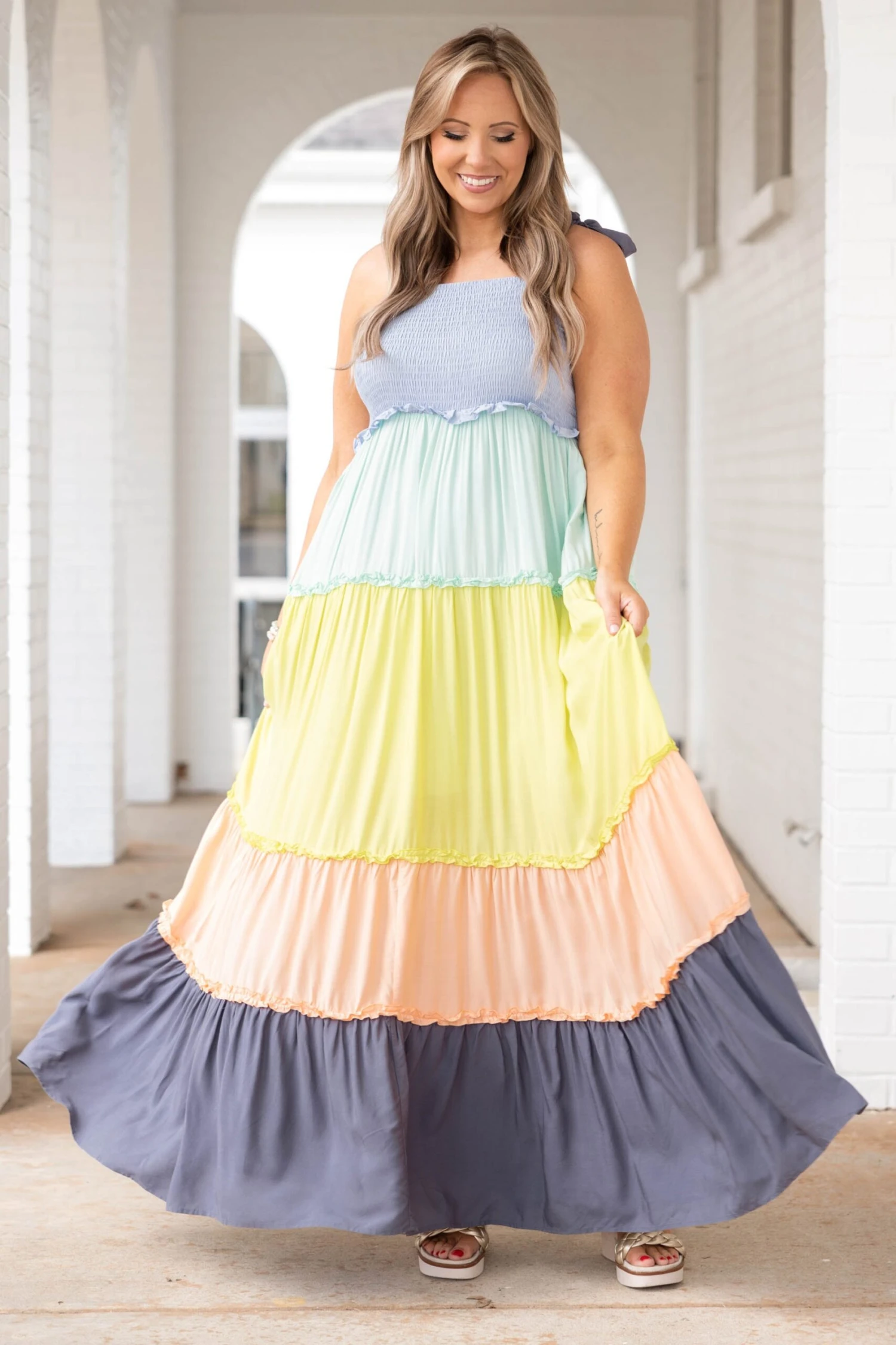We simply love this beautiful dress! This dress has a bold multi color with tie straps and a maxi design that is super sweet nd perfect for the season! WE see this dress styled with some cute accessories and heels or wedges for a classy chic look!