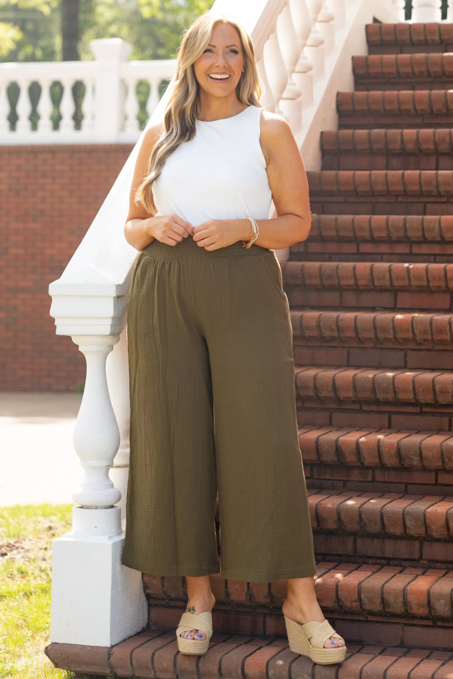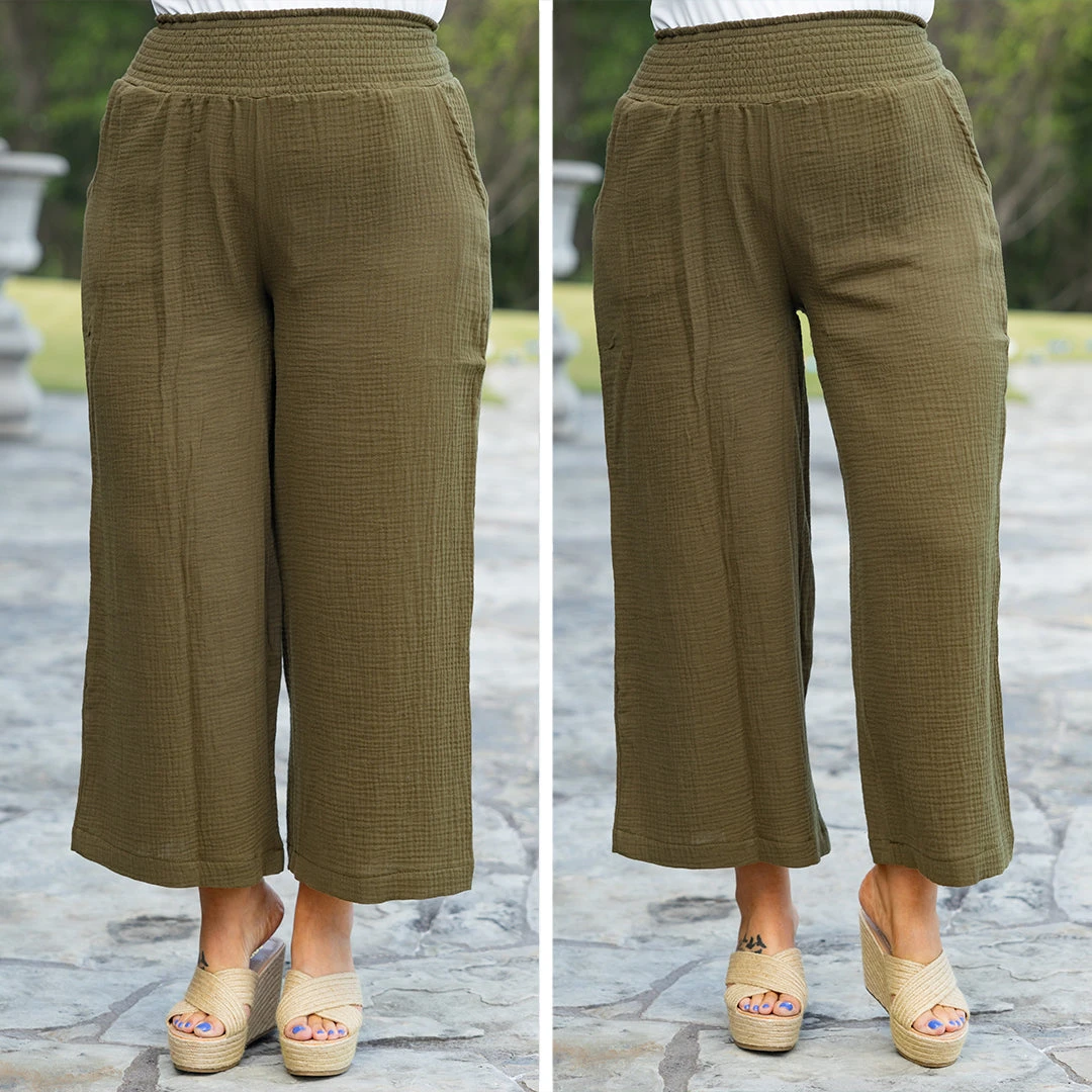 Flow freely throughout your days in these pants!  These olive pants feature a smocked waistline for comfortable wear and a flowy design for unrestricted movement! Look stylish and feel comfortable all day long in these gorgeous pants!