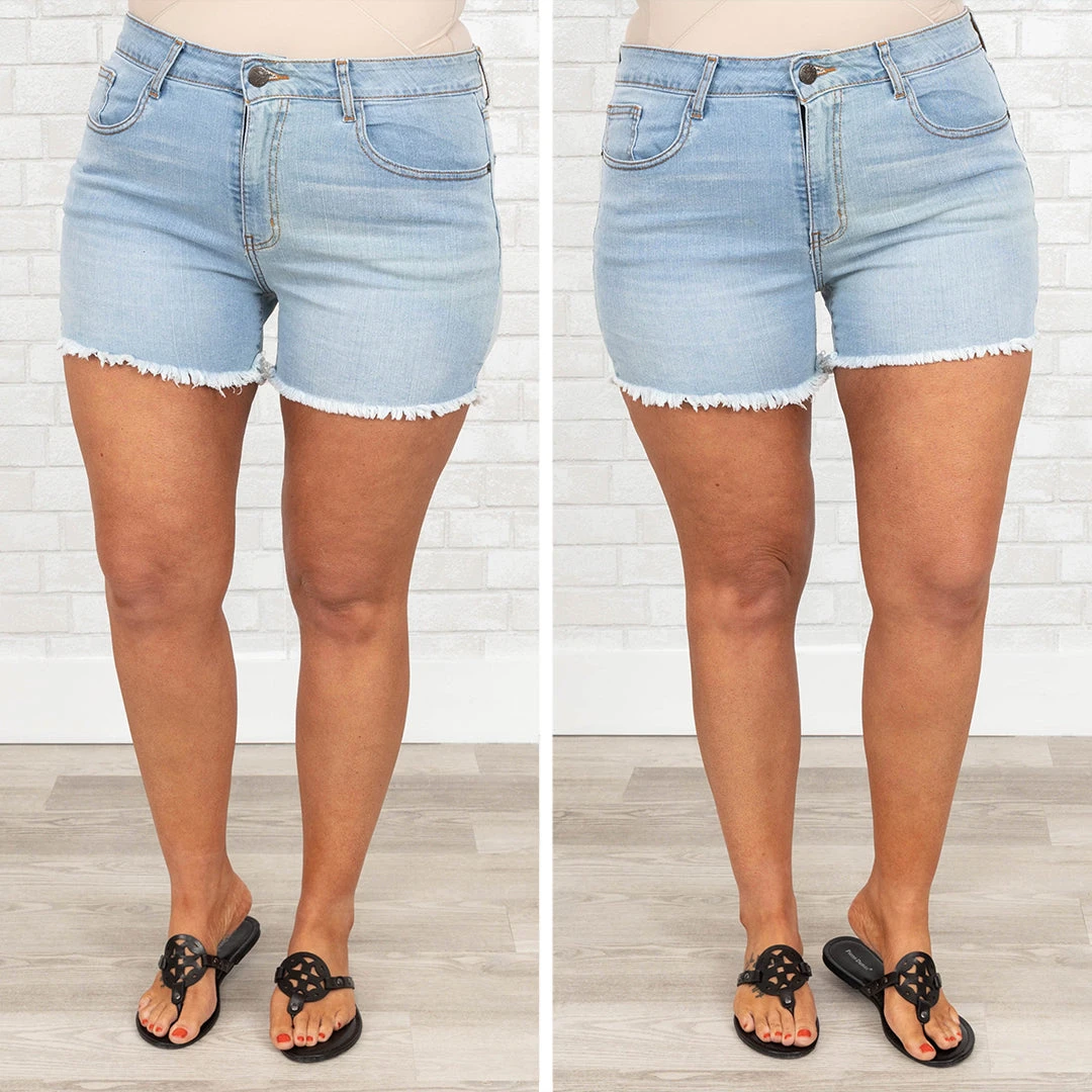 It’ll be all fun and games in these flirty shorts! They have a trendy light wash with a frayed hemline that is super chic! The stretchy, figure flattering fit is perfect for paring with a cute top and and sandals for a classic chic look!