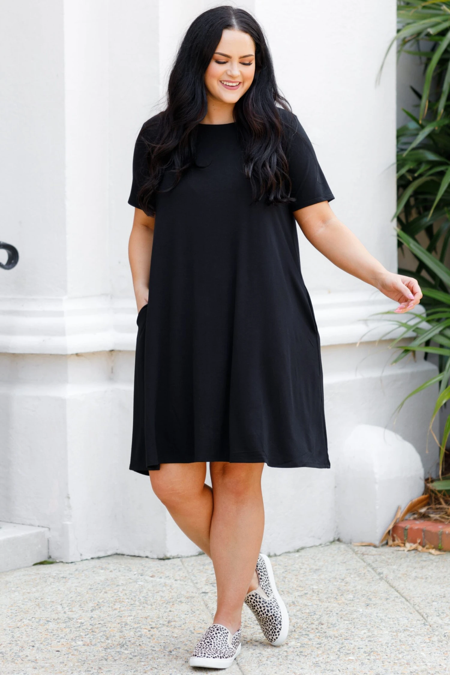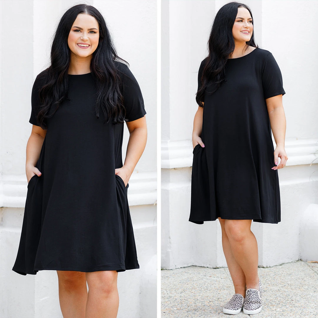 Let this dress inspire your style all season long! The classic black color is fun and the basic flowy style is so classic! The material is super soft, has pockets, and enough stretch to keep you in comfort all day! Style this with some sneakers for the perfect look!Â