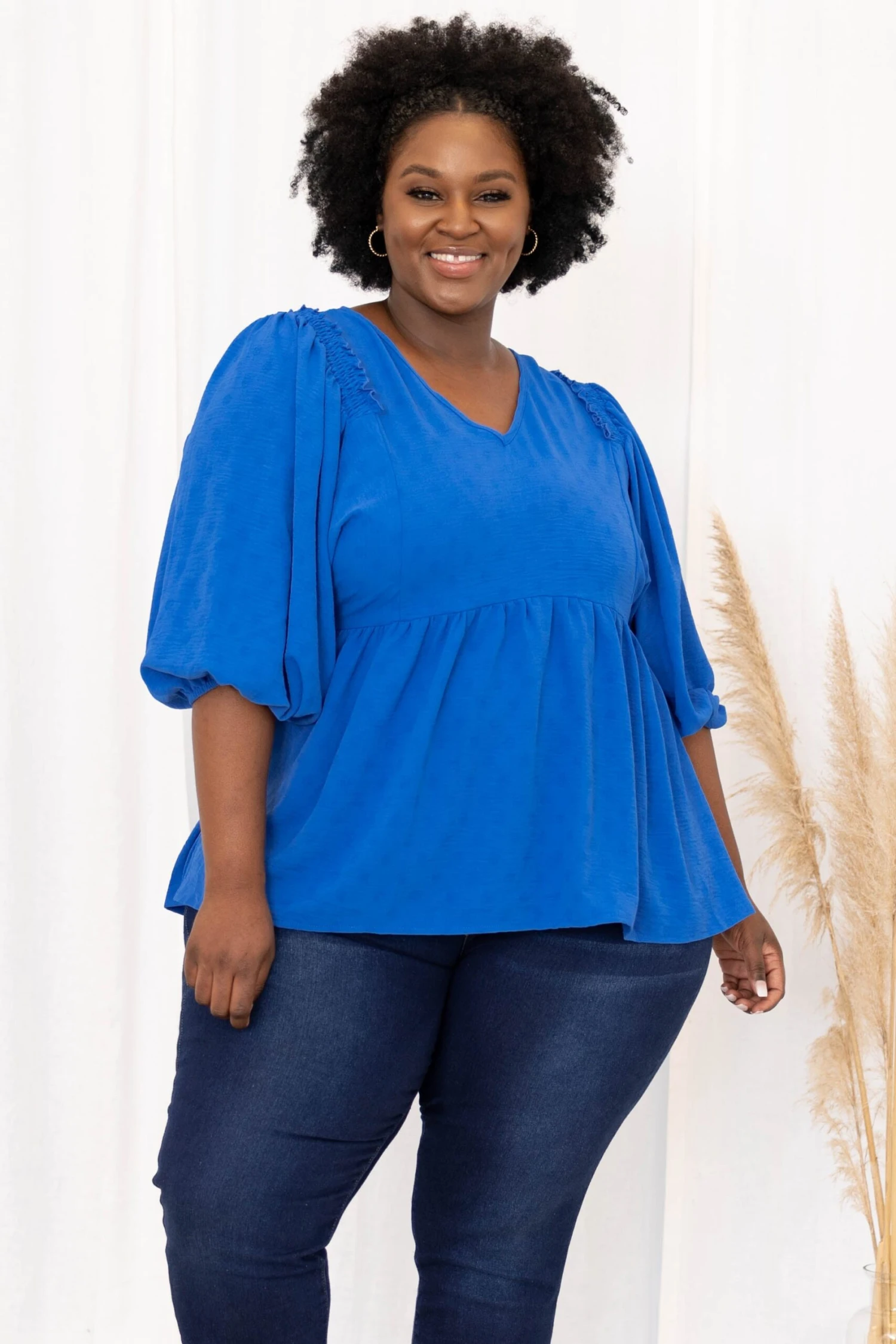 This top is everything and more! This cutie has a bold cobalt blue color that will make a statement no matter what you pair it with! The subtle polka dot pattern is so chic and the ruffle detailing on the shoulders when paired with the balloon sleeves is so fun! Pair this cutie with some fun white flares and booties for the perfect look!