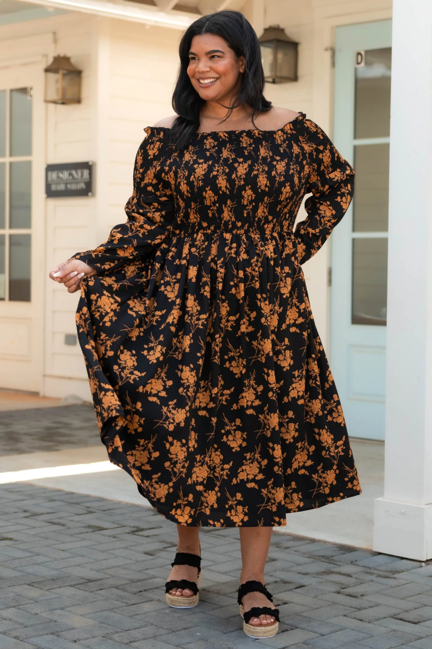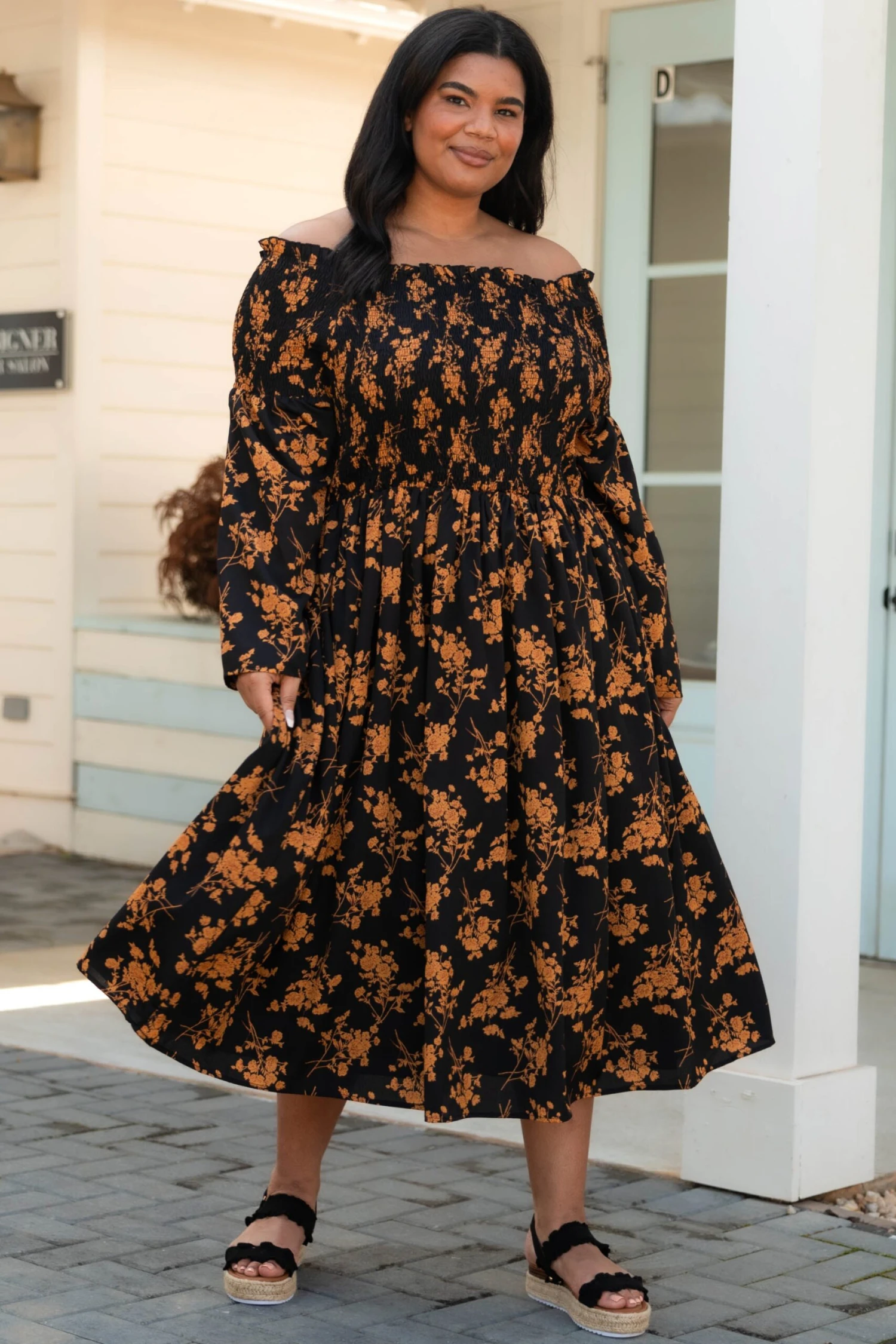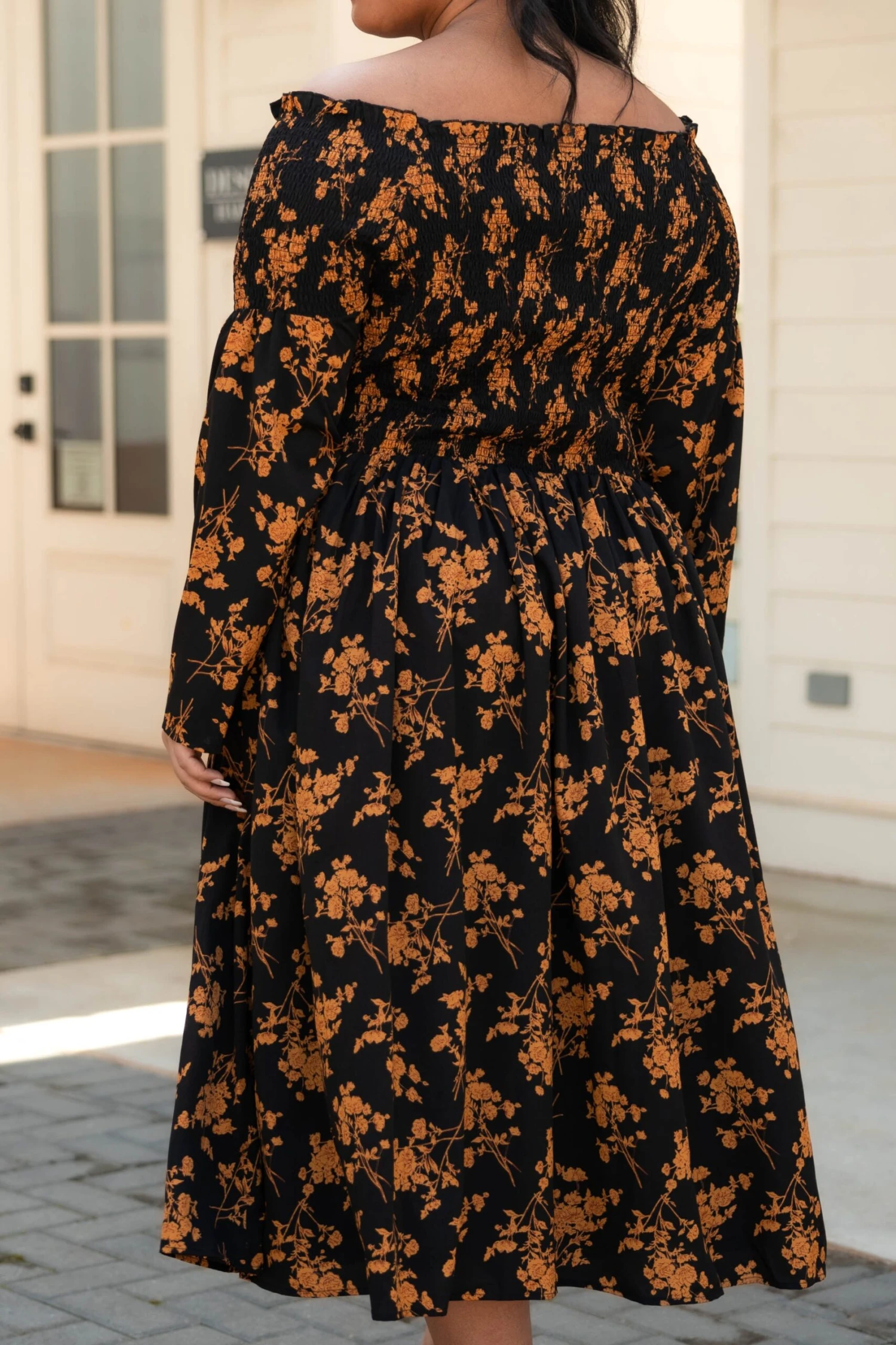 This dress is here to stay! The sleek pattern stands out with a smocked bodice and trendy off-the-shoulder design!ย The figure flattering fit of this dress is sure to make a statement while keeping you comfortable all day long!