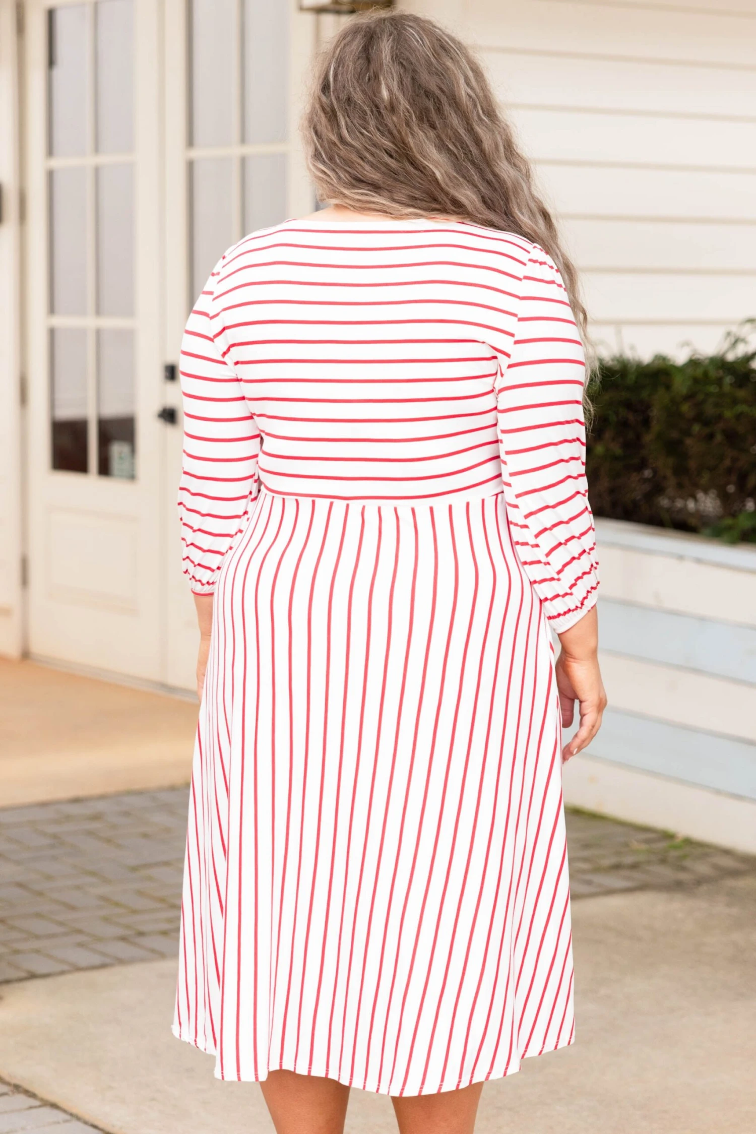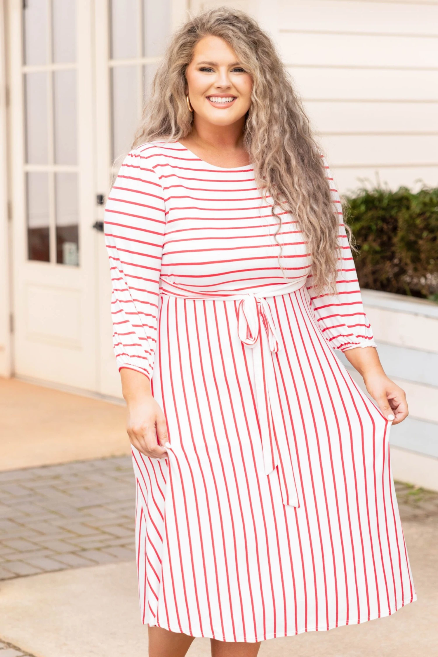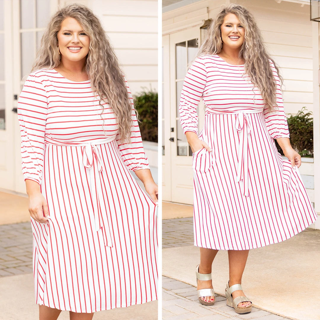 Hold hands with your love when you’re wearing this dress! This dress has the prettiest stripe pattern with a soft coral color you can style for every occasion! It’s comfortable for all day wear, has a tied waistline to flatter your figure, and even features pockets! Simply style this dress with heels or wedges for your next date night!
