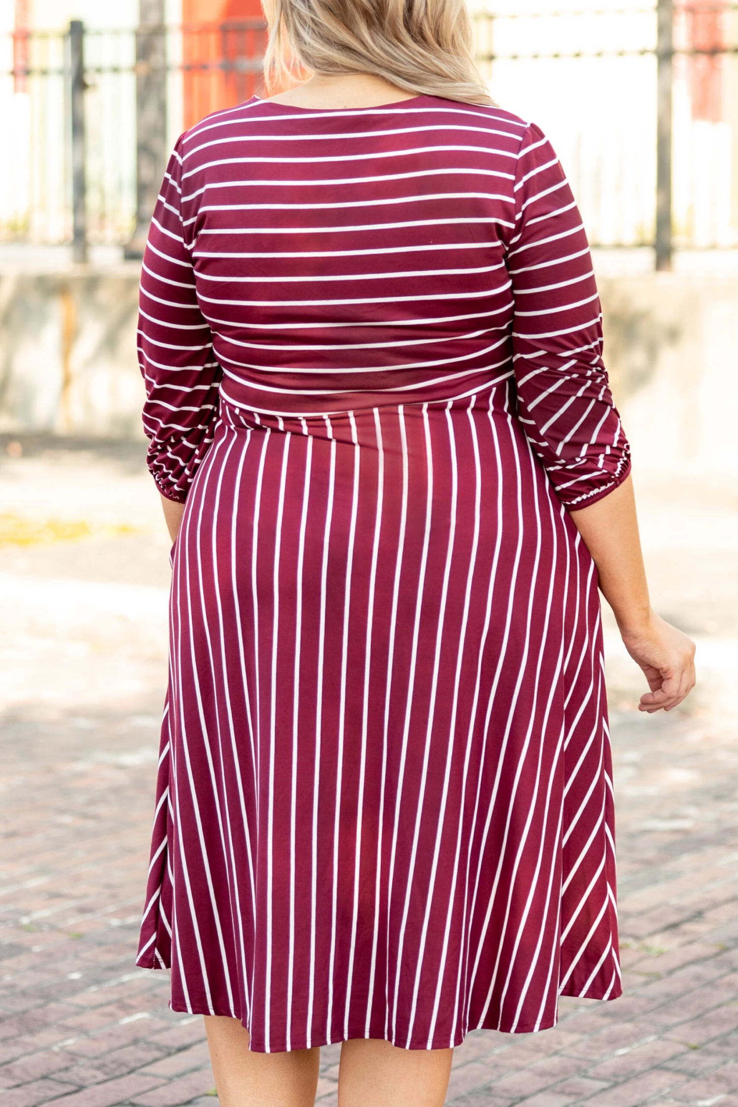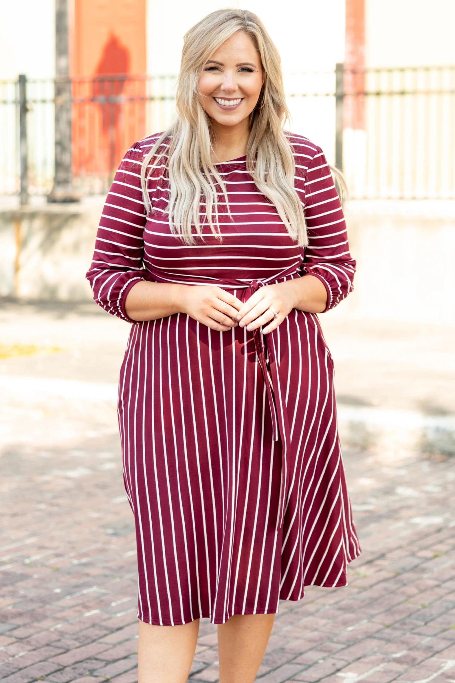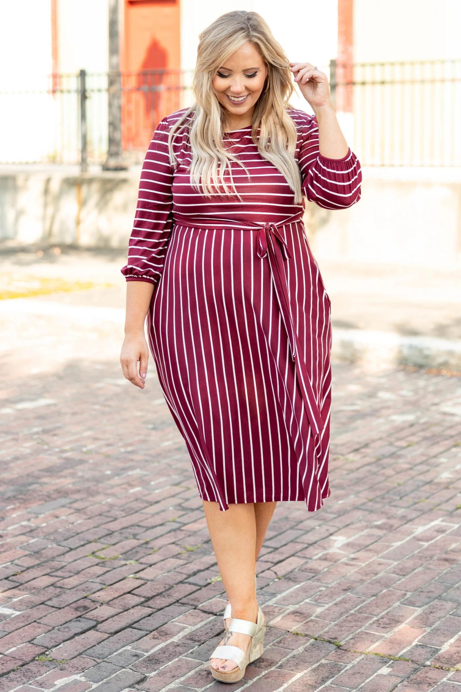 Hold hands with your love when you’re wearing this dress! This dress has the prettiest stripe pattern with a soft wine color you can style for every occasion! It’s comfortable for all-day wear, has a tied waistline to flatter your figure, and even features pockets! Simply, style this dress with heels or wedges for your next date night!Â