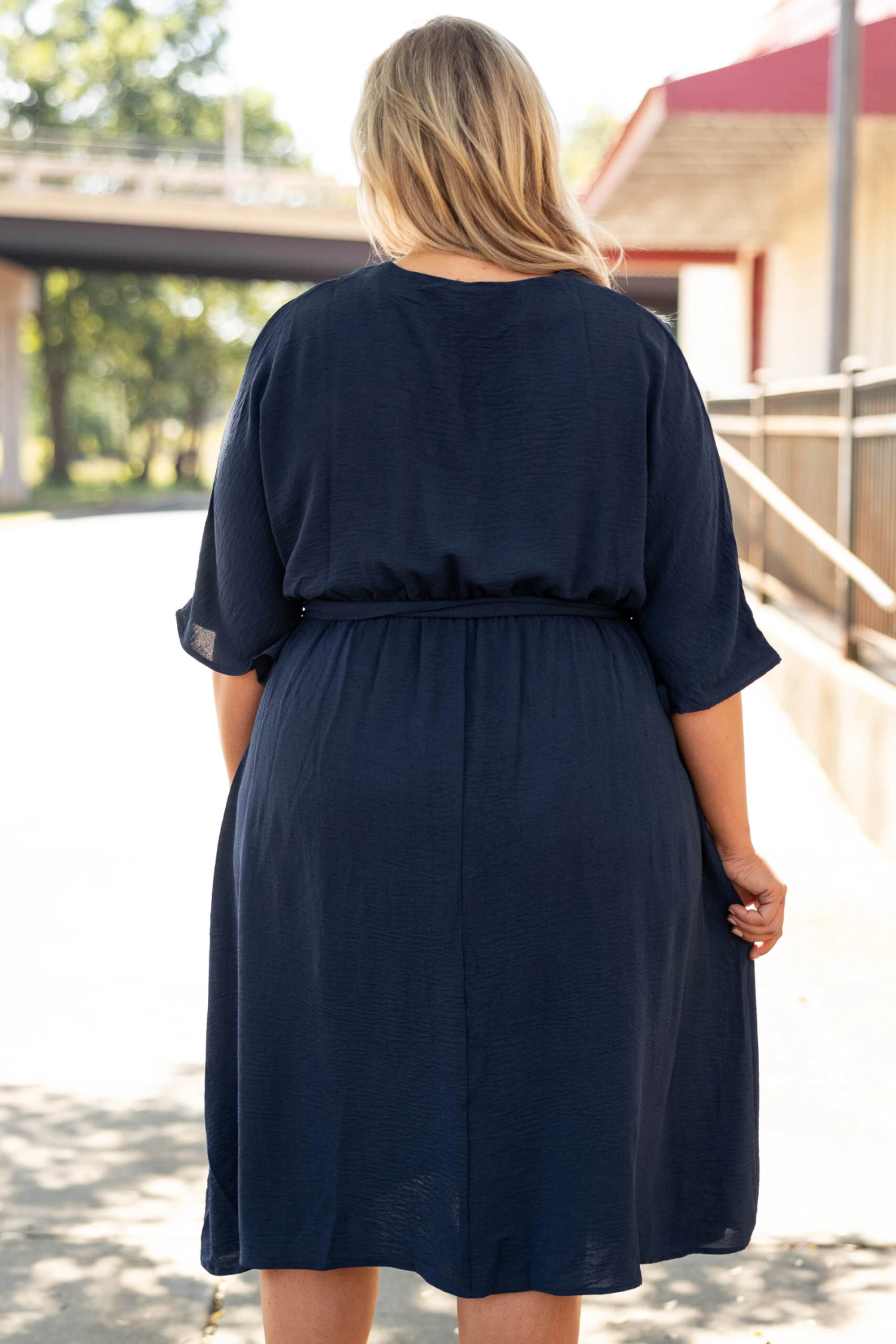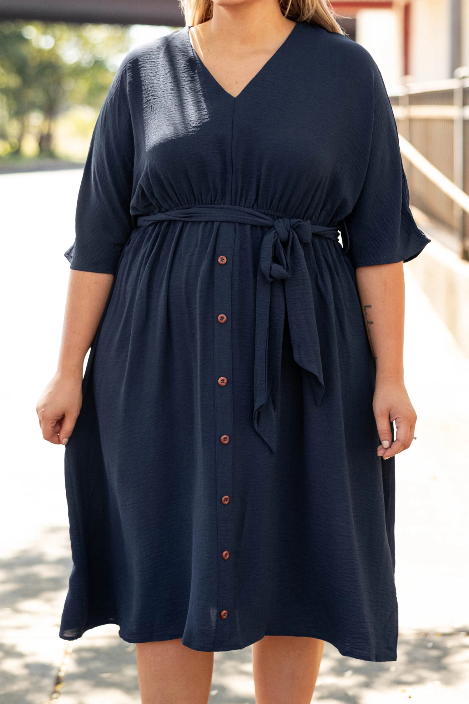We are hopelessly in love with this dress! This dress has a neutral navy color with adorable faux buttons and a sweet waist tie! The flowy, figure flattering fit is perfect for all day wear this season! Style this dress with some booties and cute accessories for a sassy chic look!
