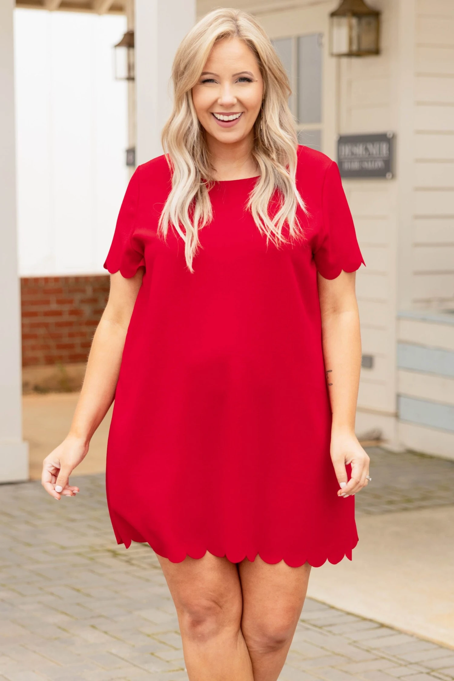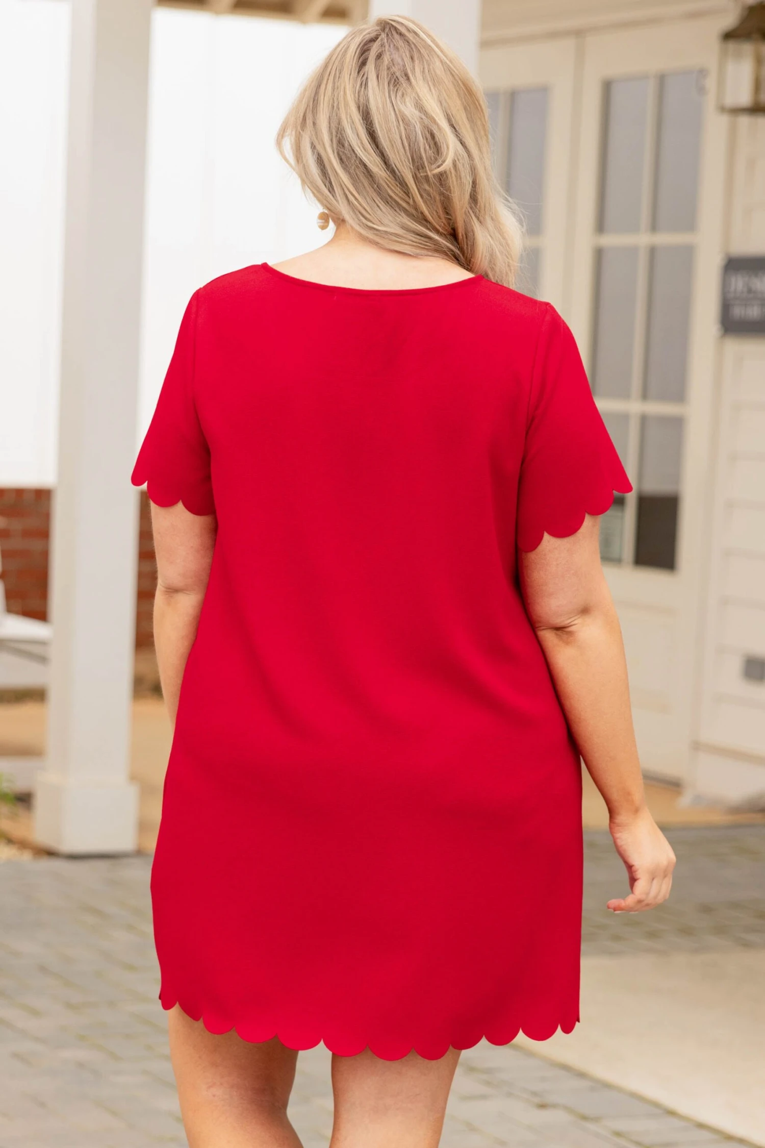 Make a grand entrance in this dress! It has a classic red color you can dress up or down for every occasion! It’s comfortable for all-day wear, has a figure-flattering fit, and features the cutest scoop neck with scalloped detailing! Style this dress with booties or heels for your next event! Â