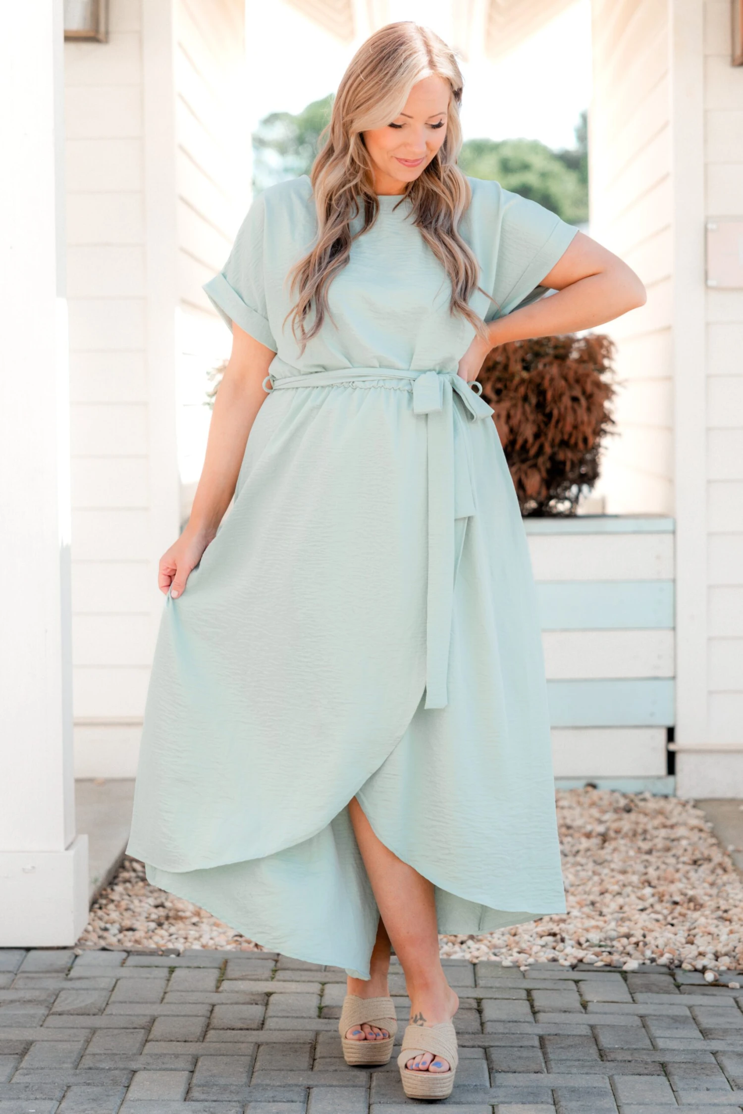 You will be stunning in this dress! It has a chic sage color you can dress up or down for every occasion! It’s comfortable for all-day wear, has a figure-flattering fit, and features the cutest tied waistline! Pair this dress with heels or wedges for an effortlessly chic outfit!