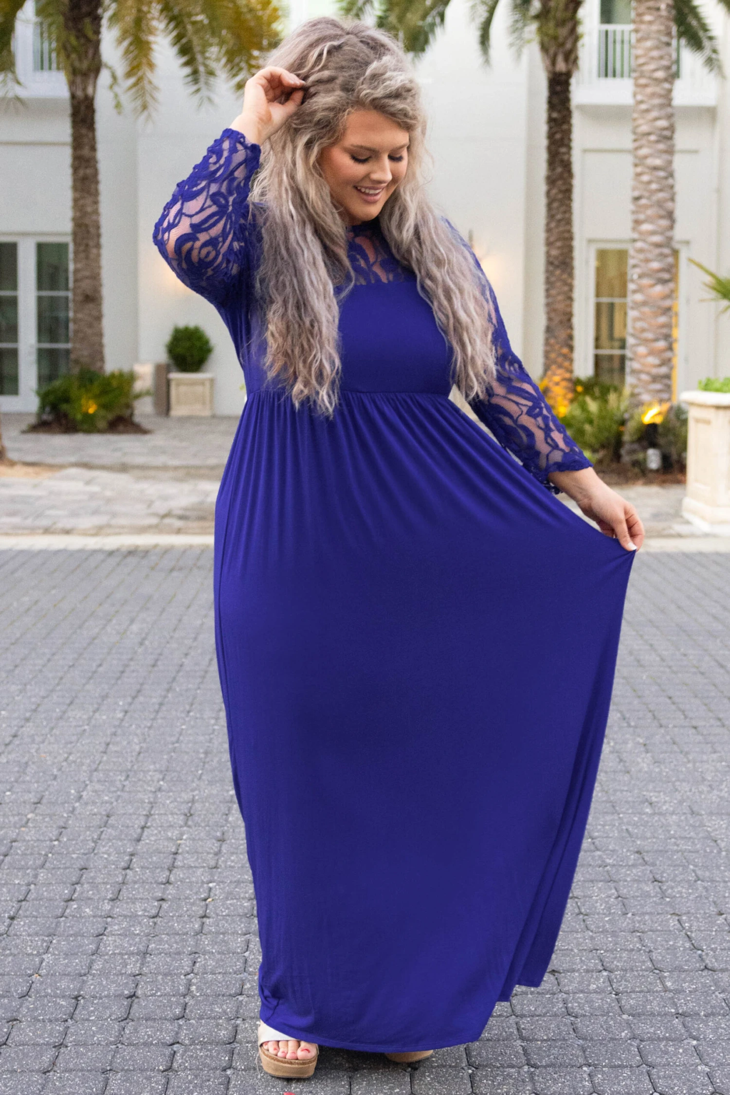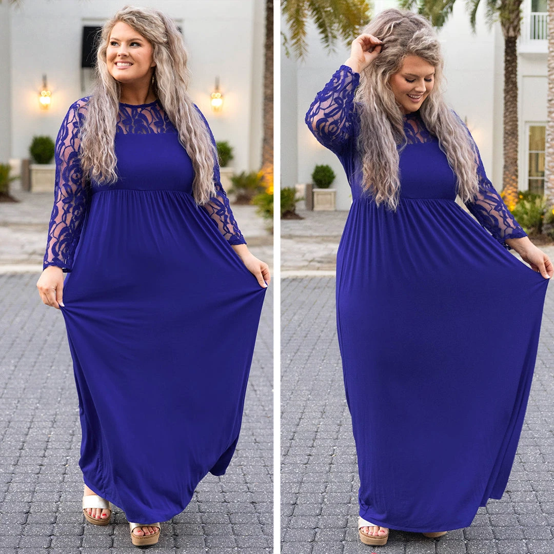 Look oh so elegant in this beautiful dress! This dress has a solid royal color you can style with your favorite shoes and accessories! It’s comfortable for all day wear, has a figure-flattering fit, and features the prettiest lace sleeves! Style this dress with heels or wedges for your next event!Â