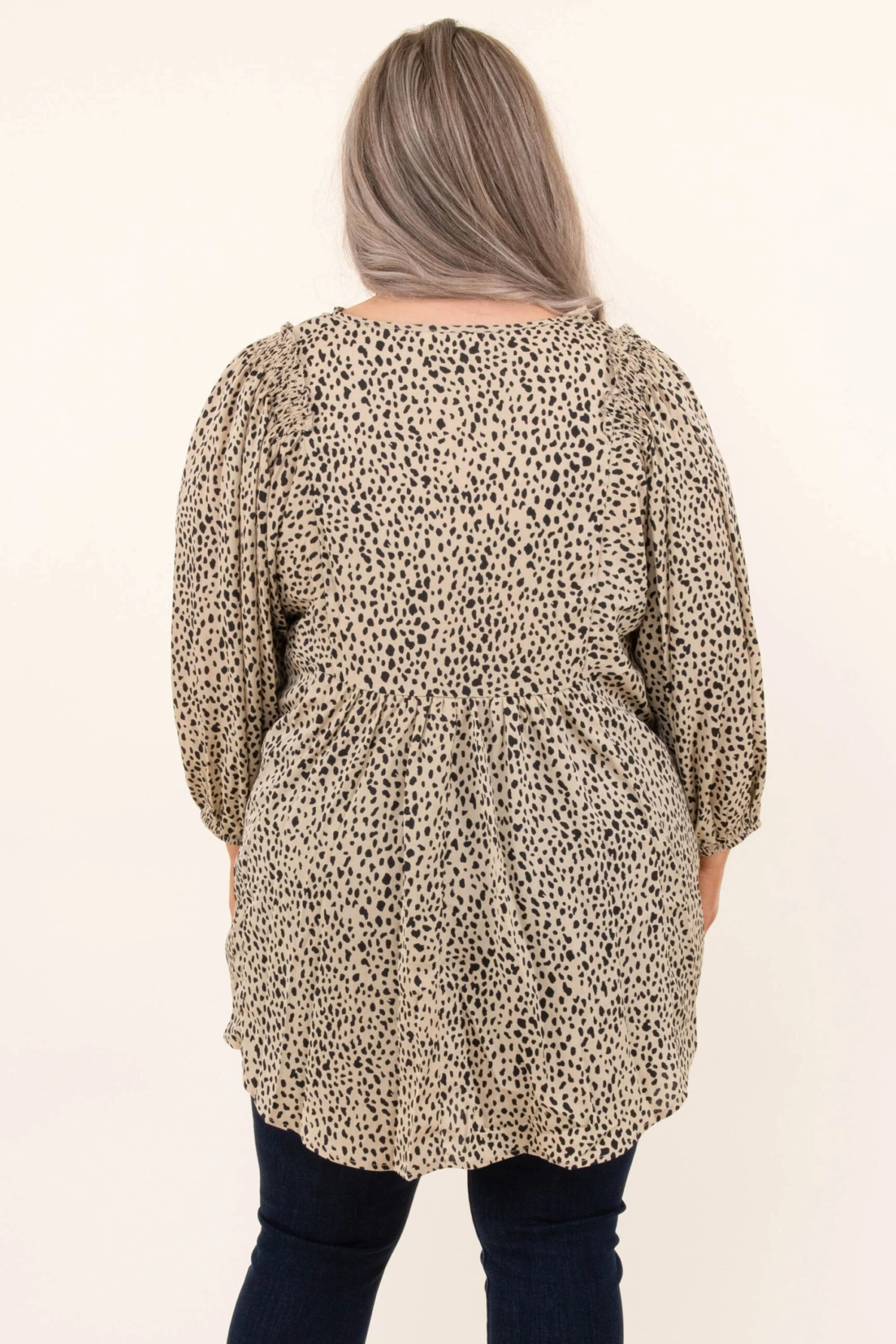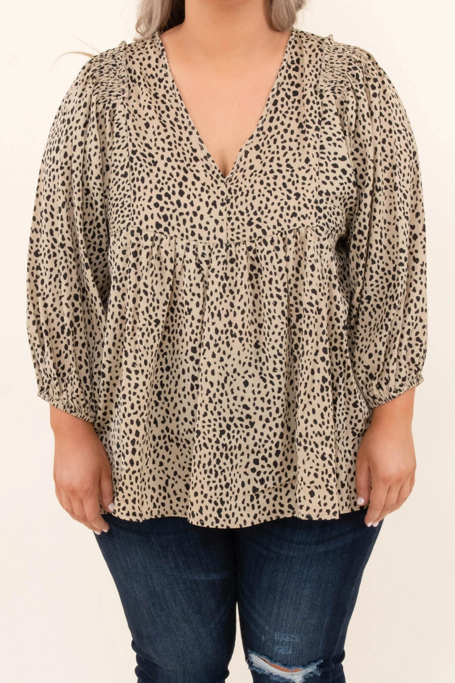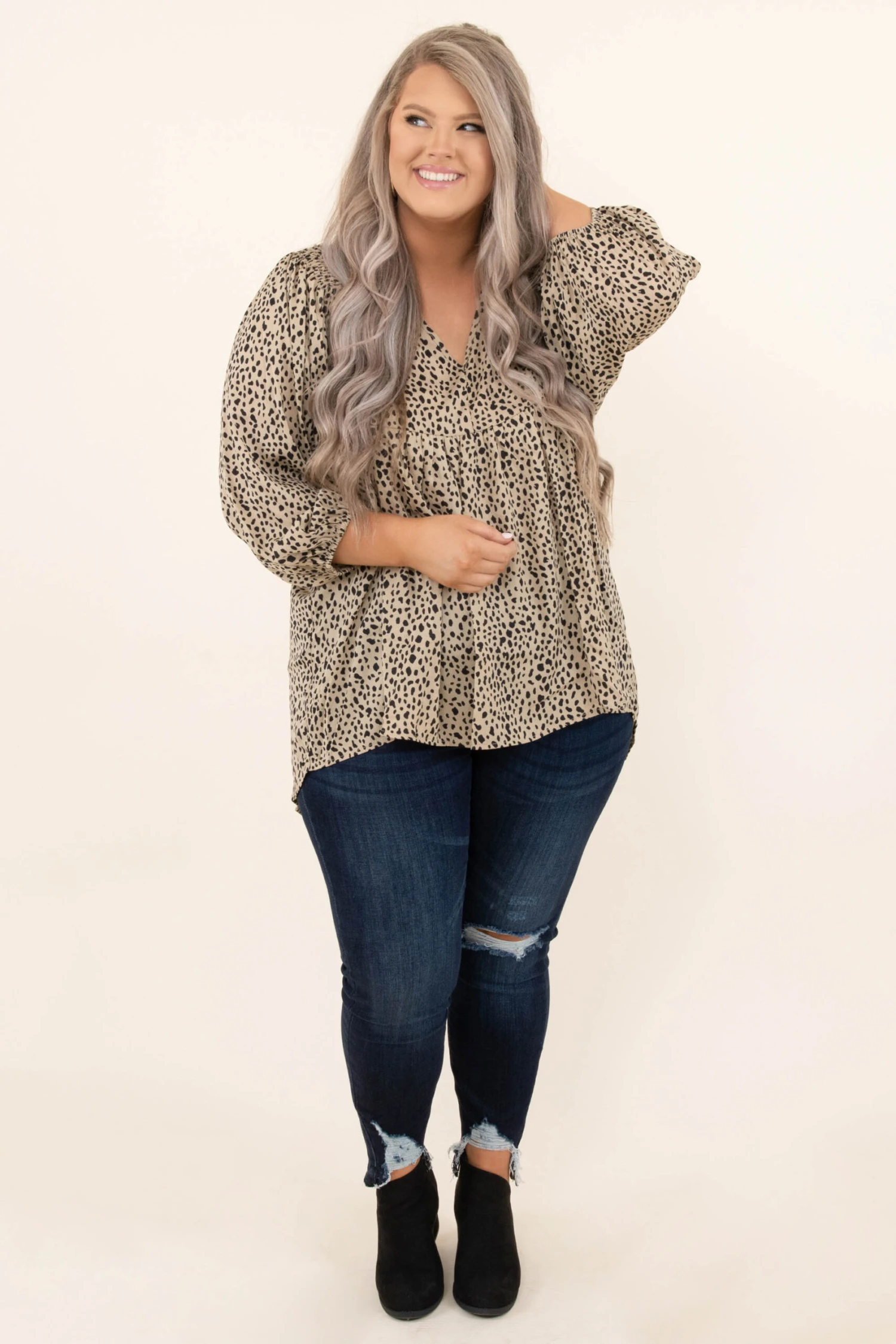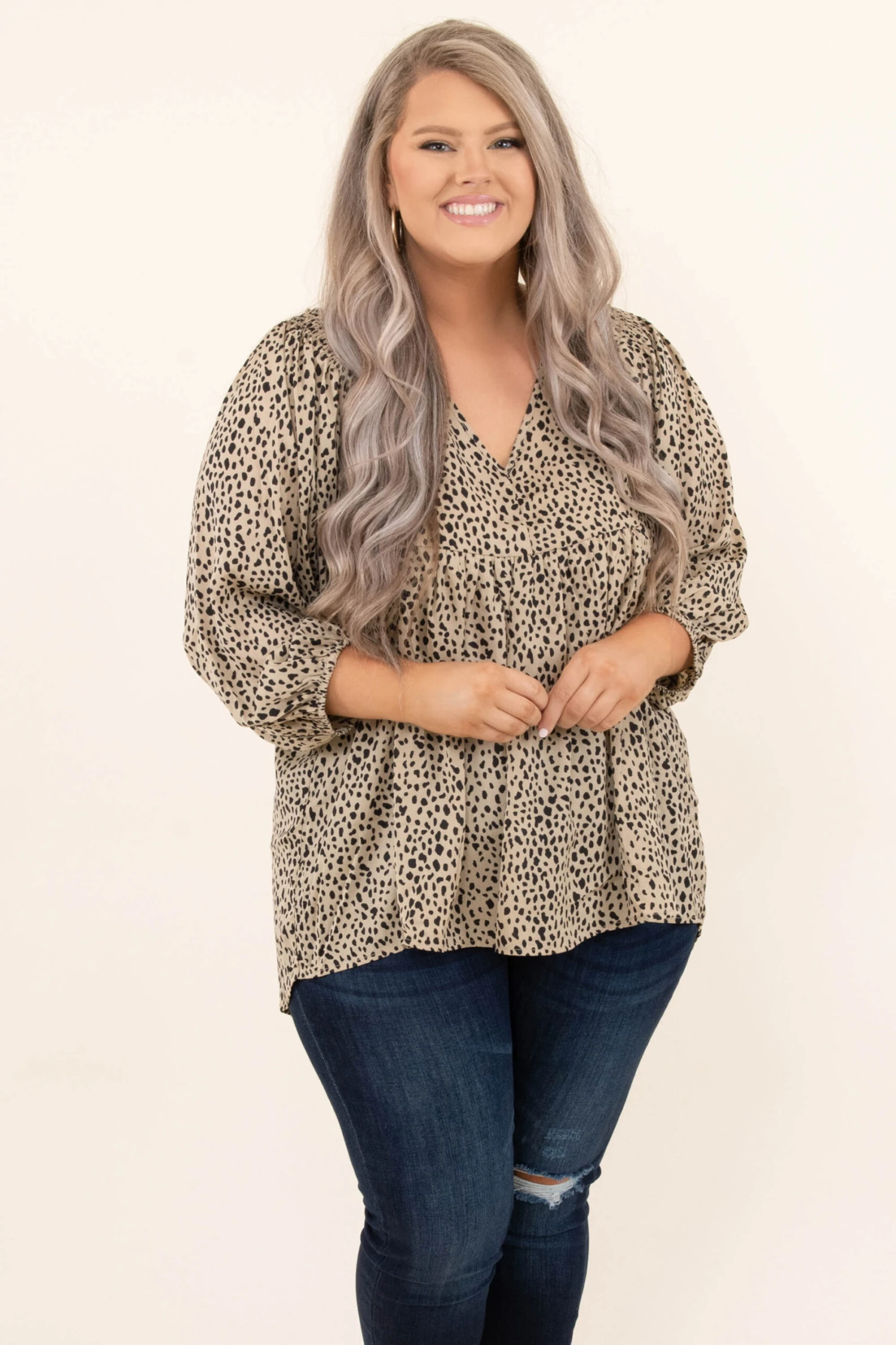 This top has a fierce leopard pattern with neutral colors you can style for every occasion! It’s comfortable for all-day wear, has a flowy fit, and features the cutest neckline! Pair this top with skinnies and booties for an easy everyday look!Â