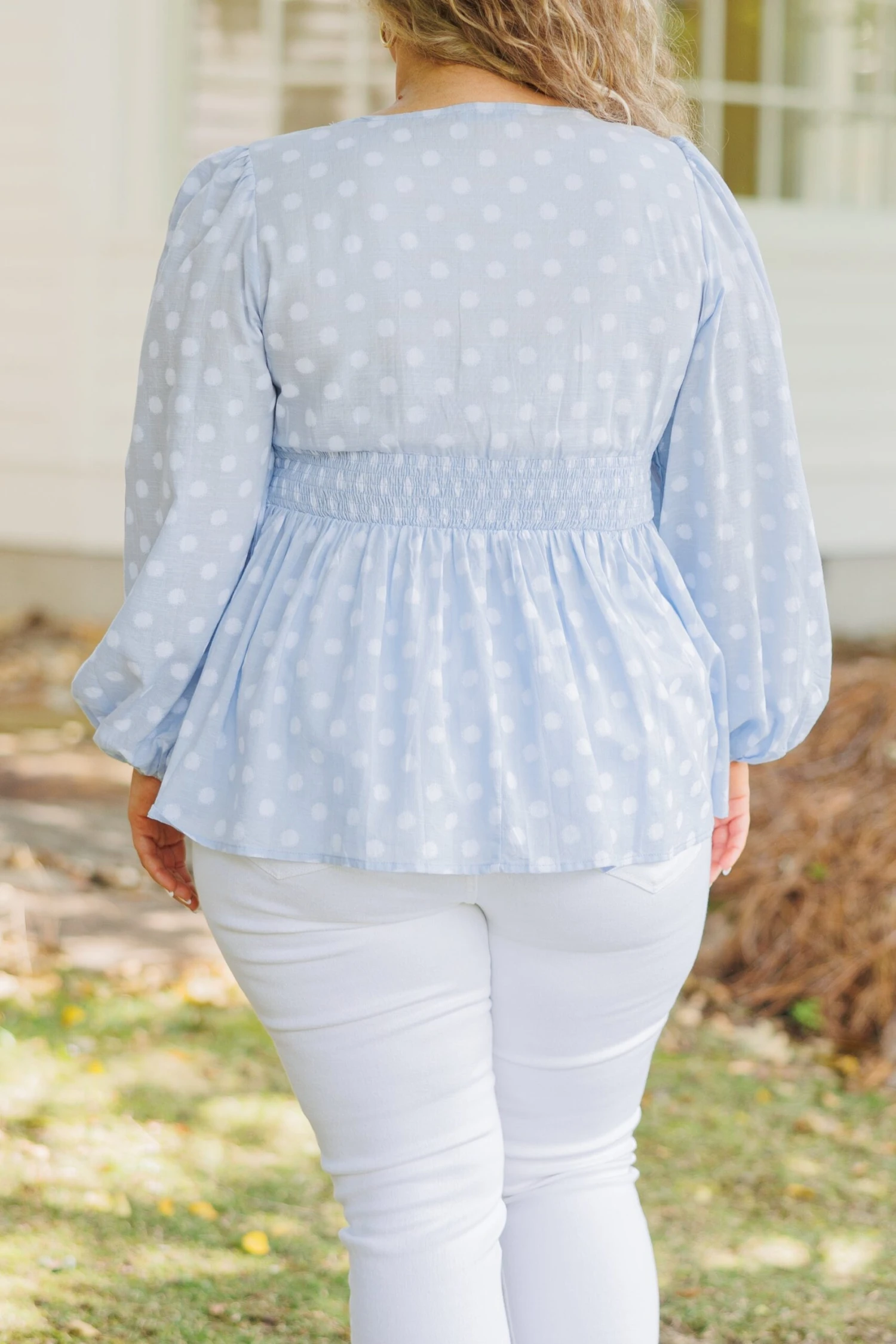 Everyone will love you in this beautiful top! It has a light blue color with a super trendy babydoll design that makes this top perfect for the season! The polka-dot pattern and flirty fit is just what you need in your wardrobe! We see this top styled with some white denim and heels for an unforgettable look!