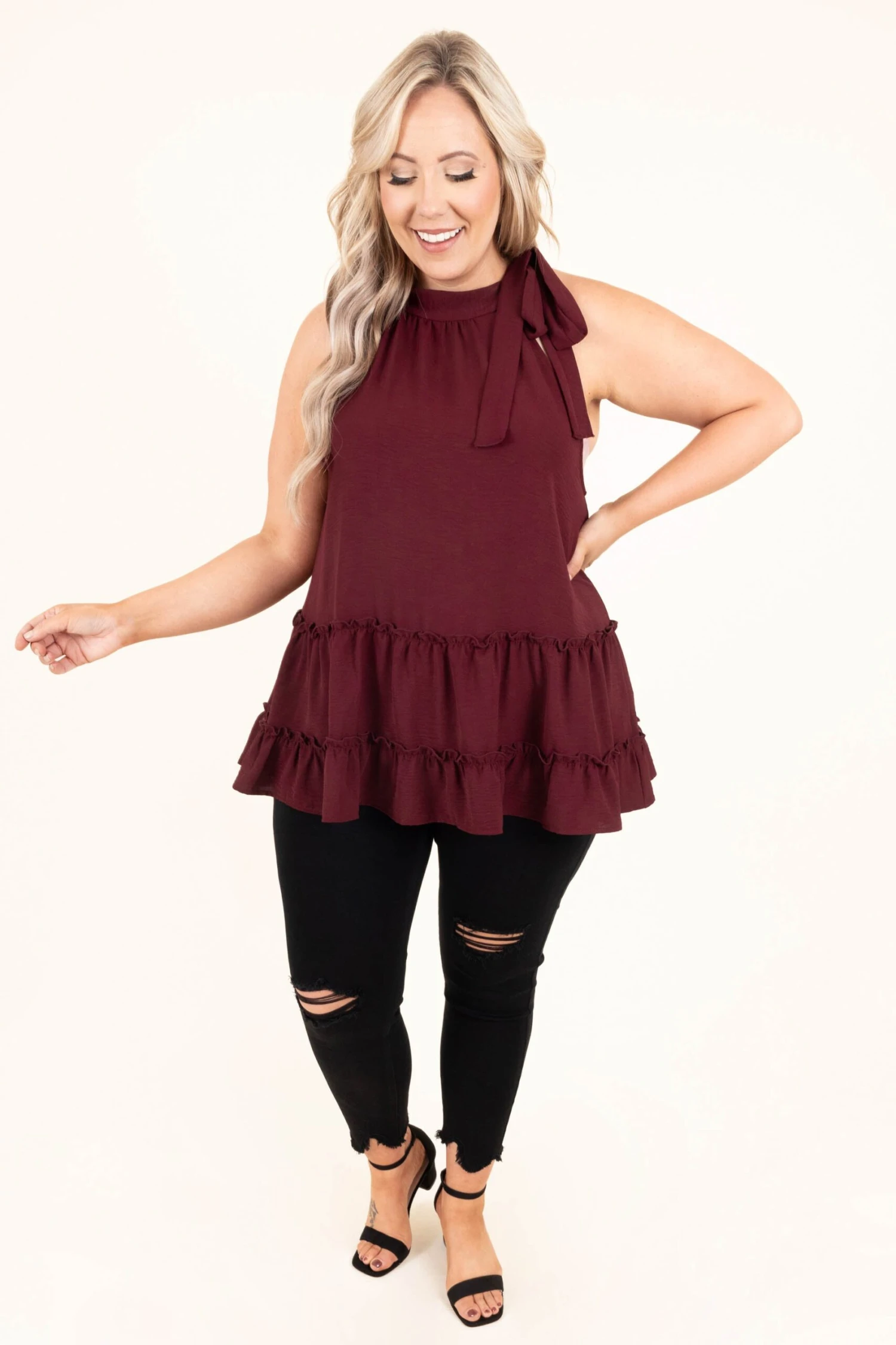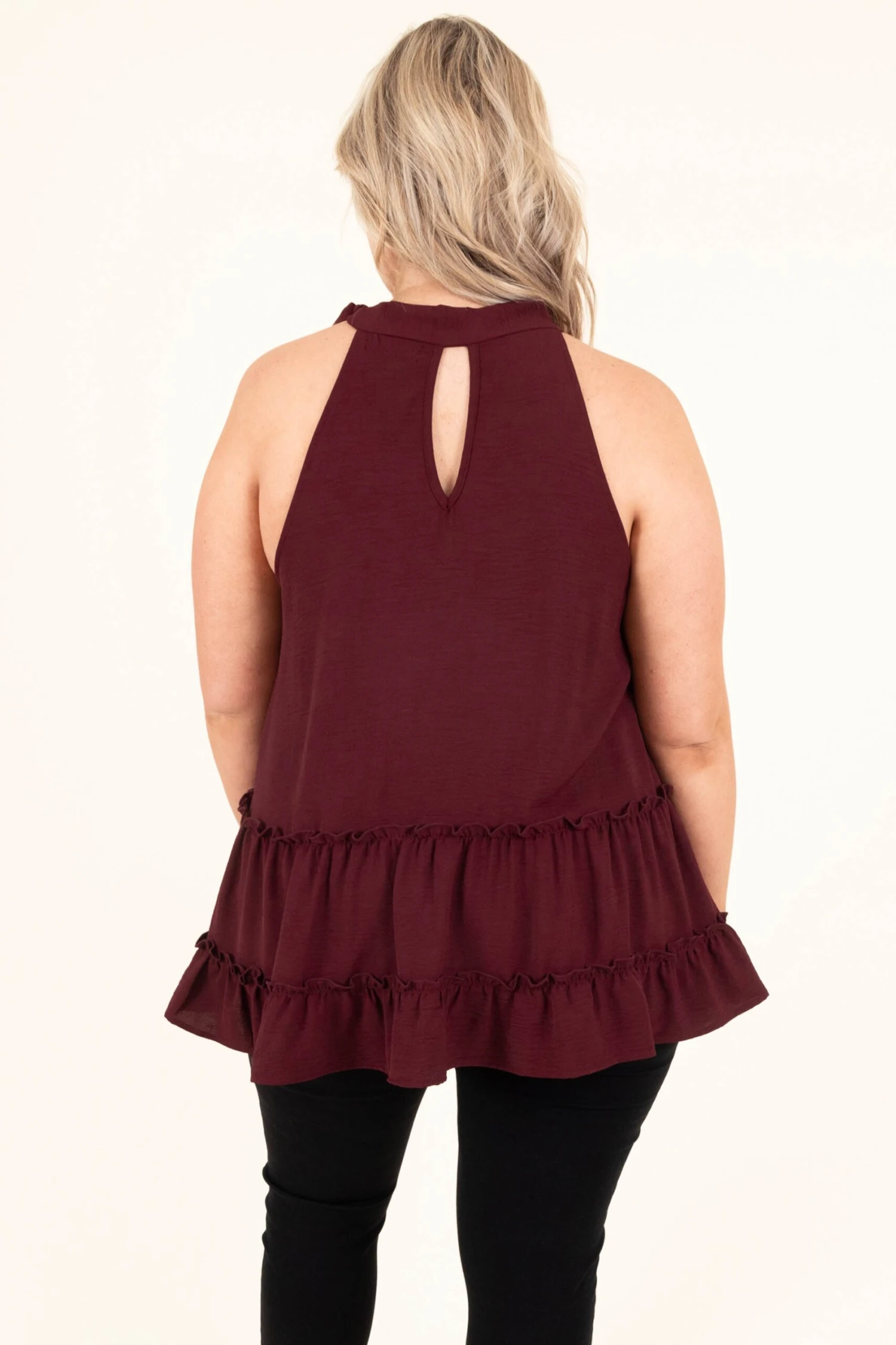 This top is absolutely fabulous! The wine color is classically chic and the tiered style will look good on anyone! We love the tie halter that is so flattering and the keyhole clasp in the back is so flirty! Style this with some distressed skinnies and heels and you have a super chic look!
