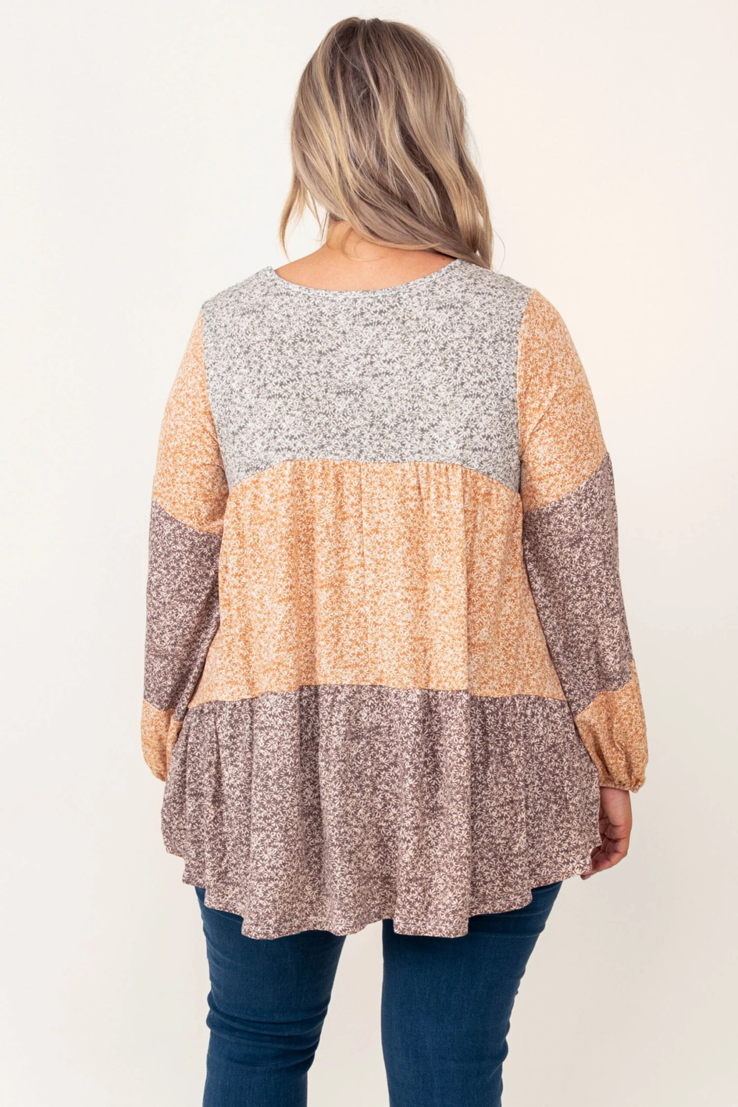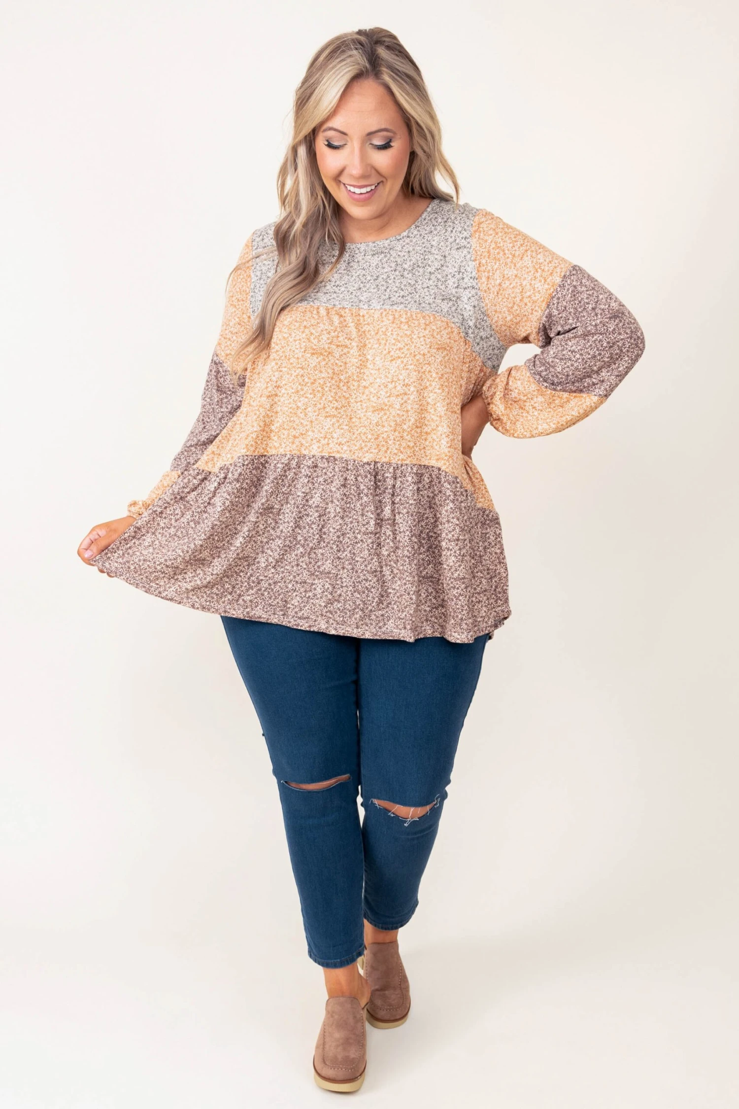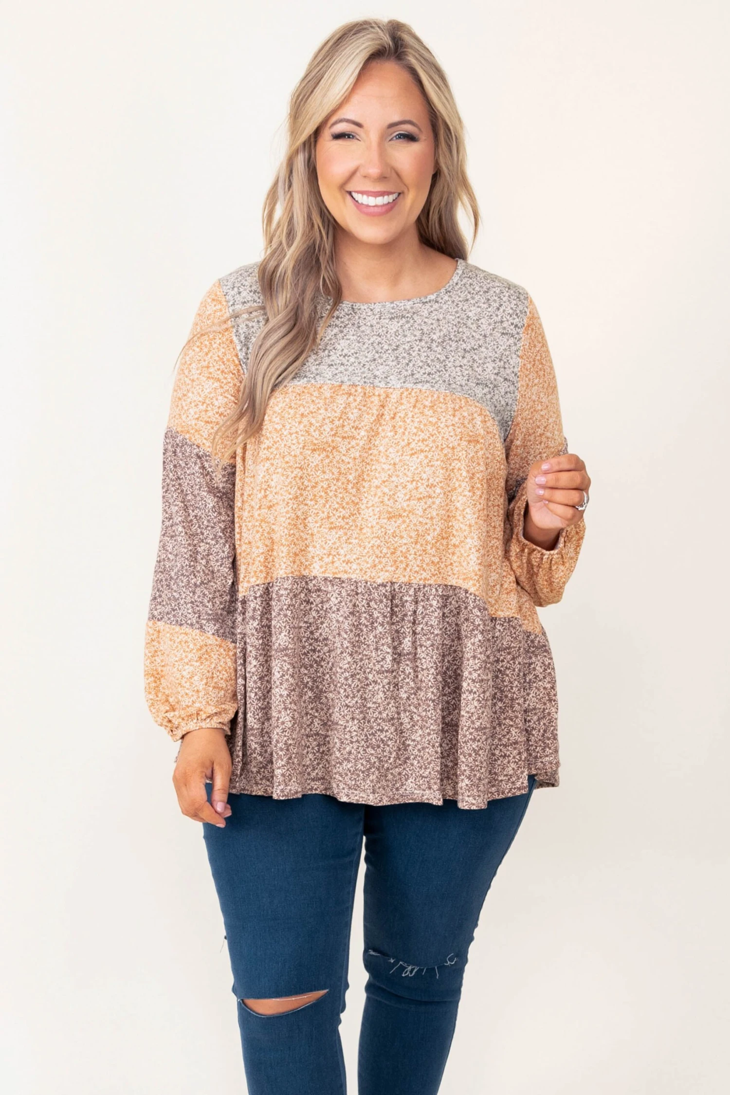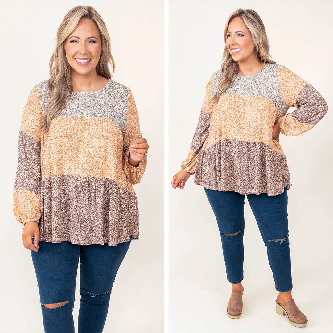 This top has stolen our hearts! It features the cutest balloon sleeves and color block design! It is comfortable for all-day wear, easy to dress up or down, and is so easy to style with everything in your closet! Pair this mocha and mustard top with your favorite denim and sandals for a chic, spring look!