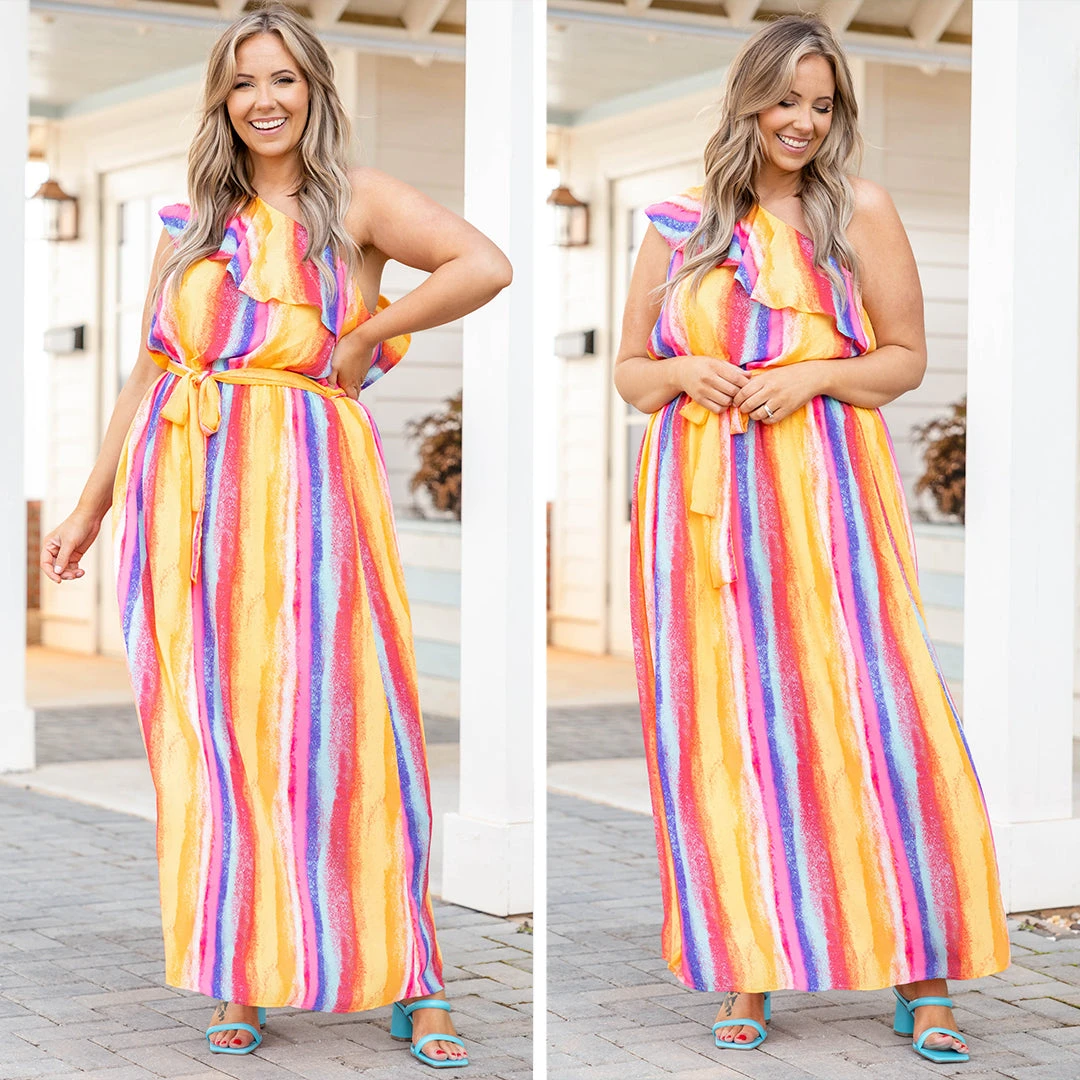 You’ll be the queen of striped in this lovely dress! This dress has a multi color combo and one shoulder design that is just in time for Spring! The ruffled neckline and chic wait tie are great additions to an already perfect dress! Style this dress with heels and cute accessories for a look they’ll never forget!