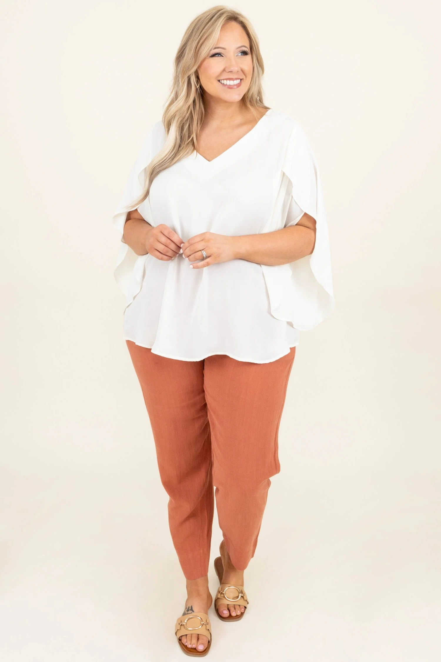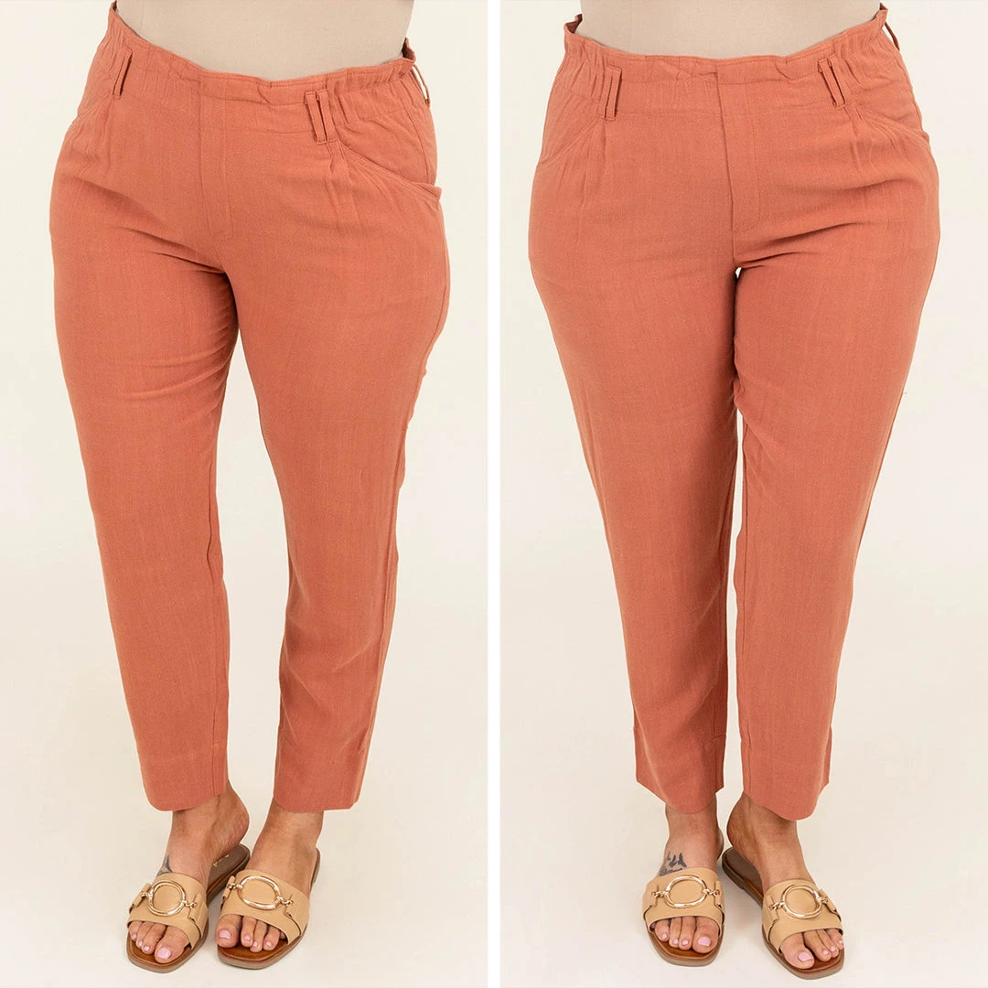 Put on these pants and a super cute top and you are ready to go! These have a stunning clay color and a super trendy paper bag waist that is sure to flatter! The elastic waist makes these so comfy for all day wear and the linen material is perfect for spring! Pair them with a solid top and some sandals for a super stylish look!