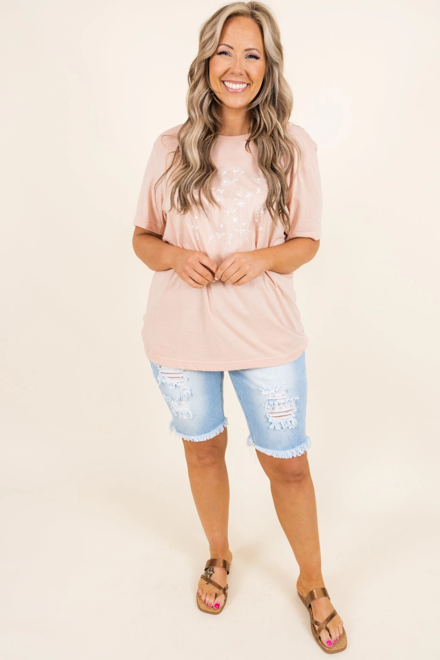These shorts were made for Saturdays! These shorts have a classic light wash you can style with your favorite pieces! They’re comfortable for all-day wear, have a figure-flattering fit, and feature the cutest distressed and frayed hemline! Pair these shorts with a flowy top and sandals for an easy everyday look!Â