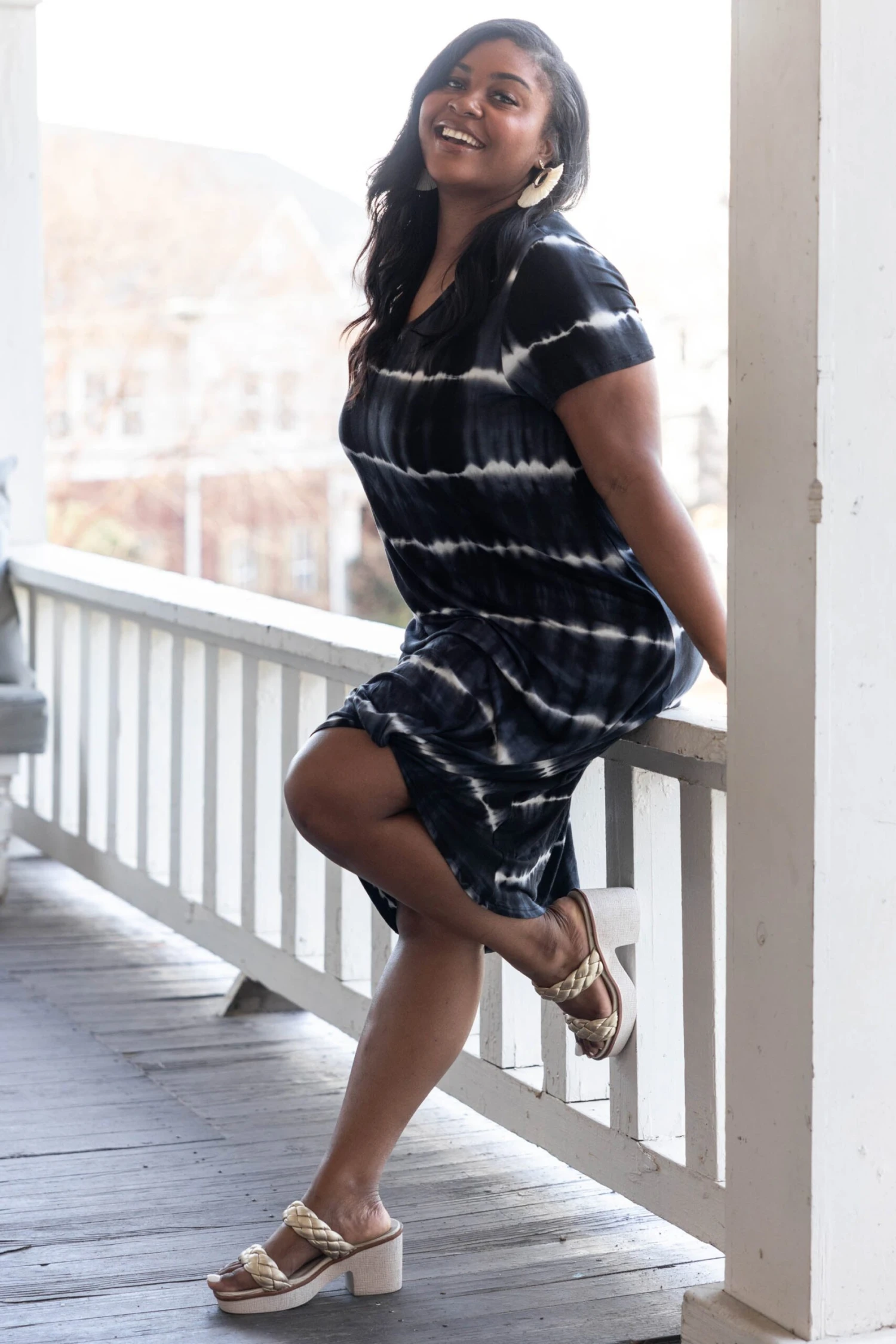 We are in love with this gorgeous dress! The black tie-dye design and knotted hemline is so sweet! The stretchy, figure flattering is so comfy and easy to pair with heels or sandals for an everyday chic look!