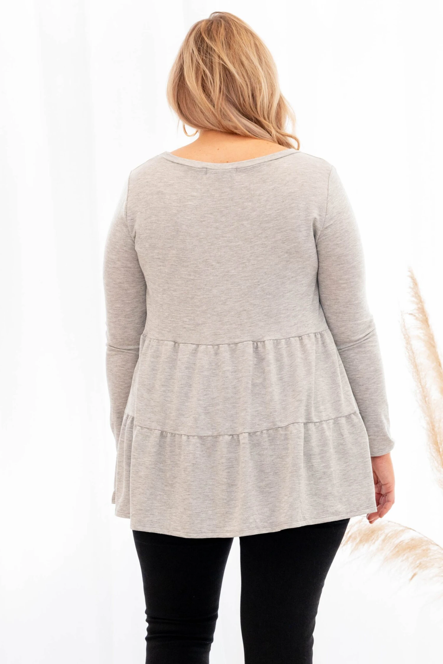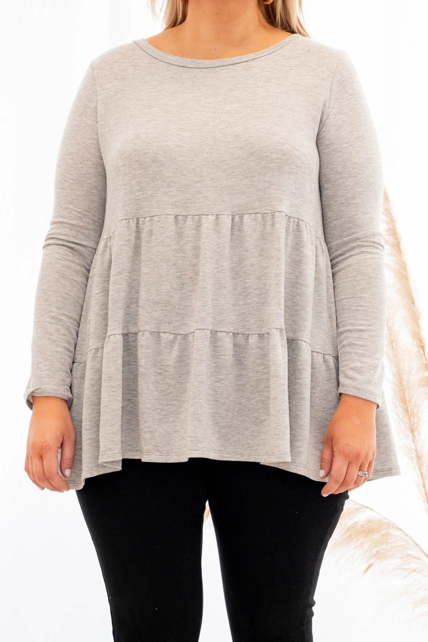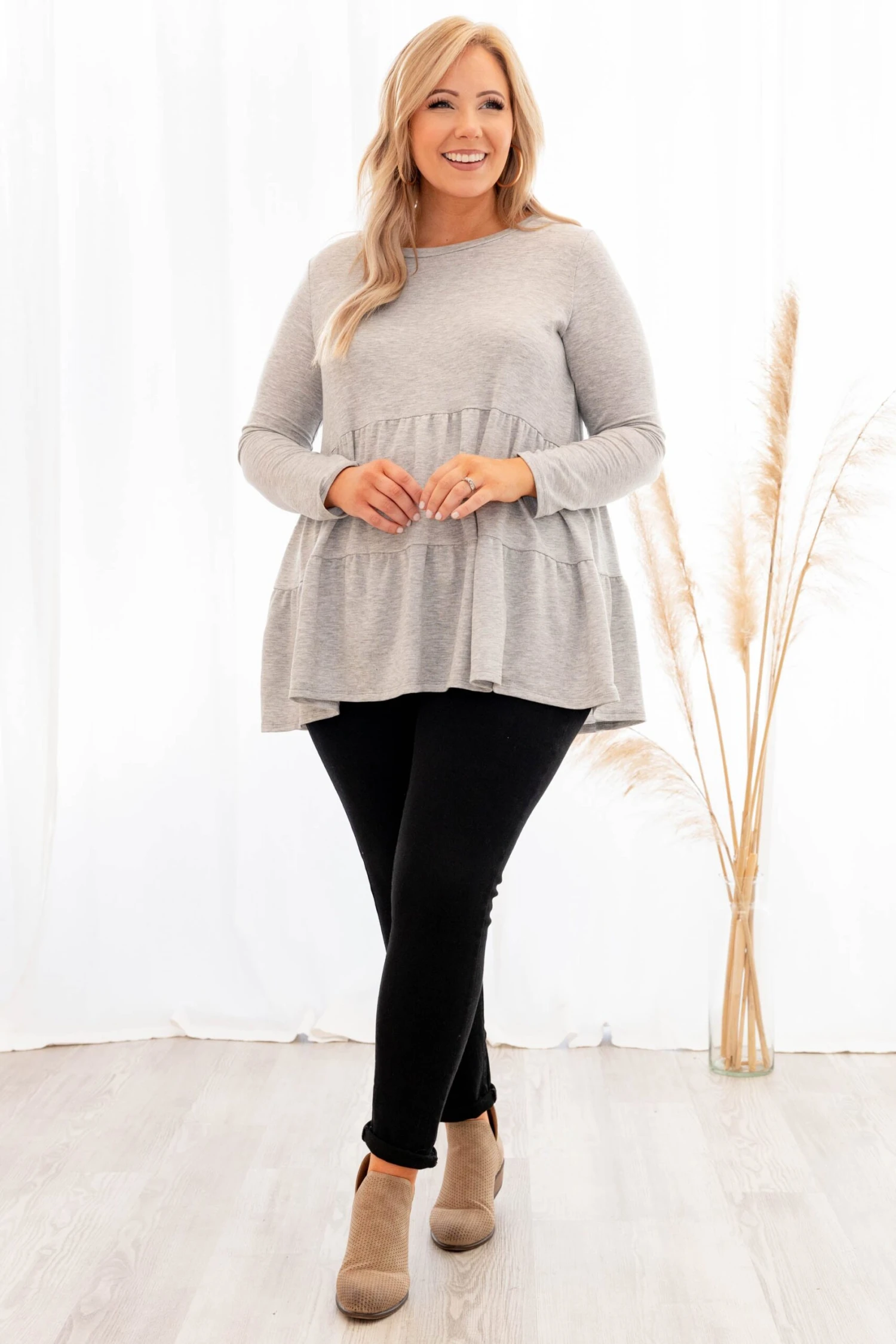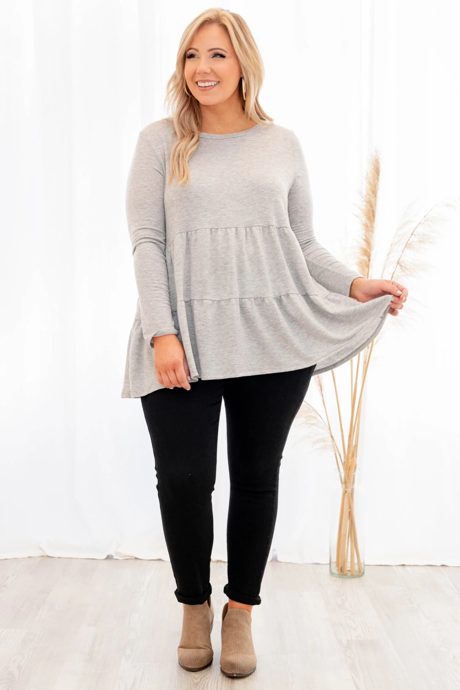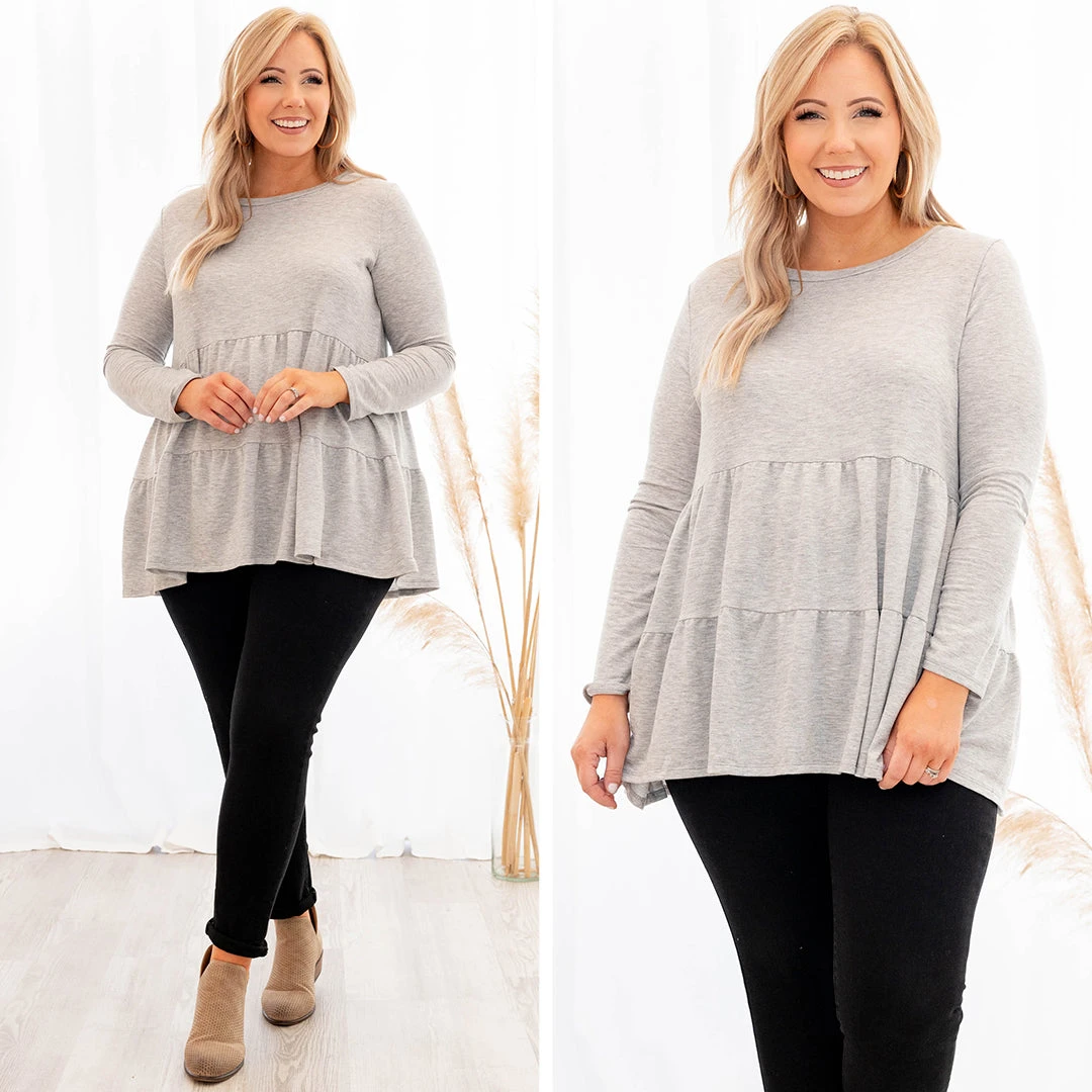 You will be stealing hearts in this new top! It has a neutral gray color with a sweet babydoll fit. Style this under a cardigan or vest for a chic winter look!