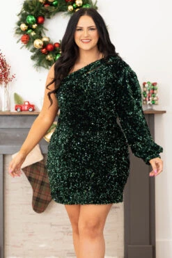 Strut into the room in style wearing this beauty! This gorgeous dress has a dazzling hunter green color with a flirty one shoulder design that is SO chic! The sequin pattern and figure flattering fit is perfect for a holiday party or even a date night! This dress is fit for any occasion! Style this dress some heels and cute accessories for an unforgettable look this season!