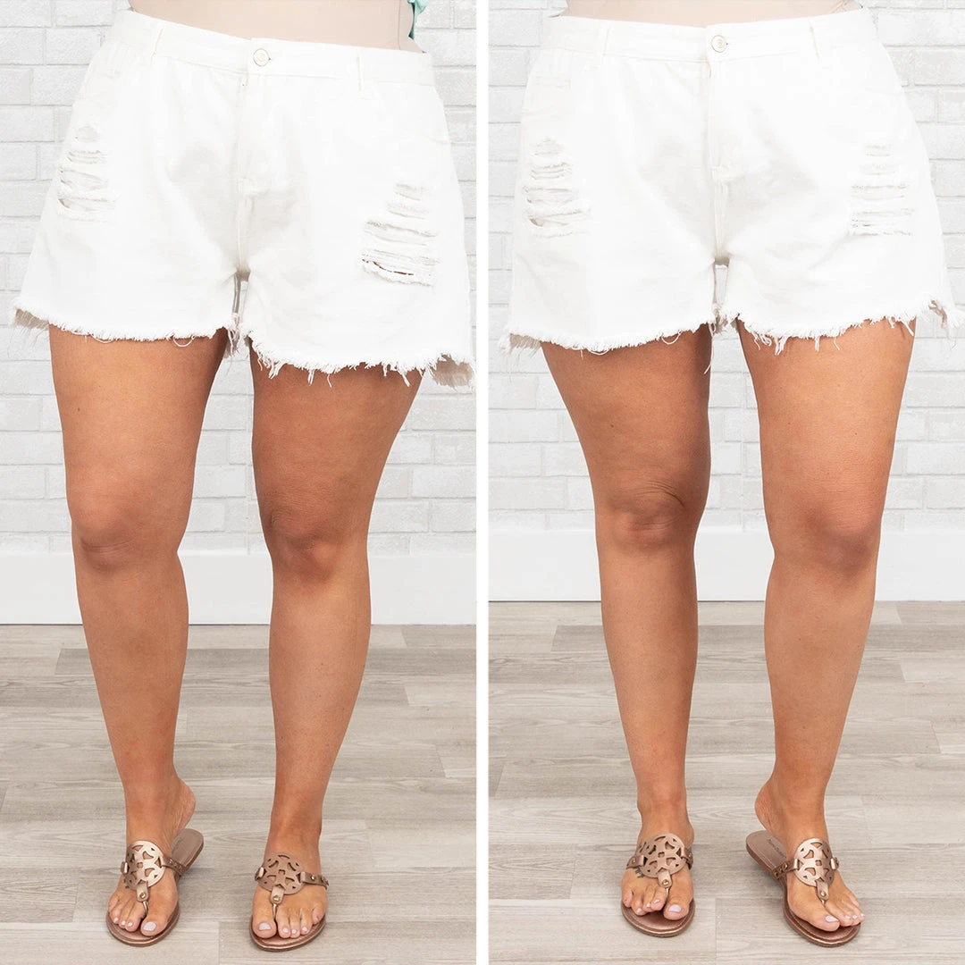 Our love for these shorts is fully tangible! The white color is perfect for elevating an outfit and the frayed hems and distressed look is so trendy! We love the relaxed fit of these that is sure to flatter! Style them with a fun top and shoes for a perfect look everytime!