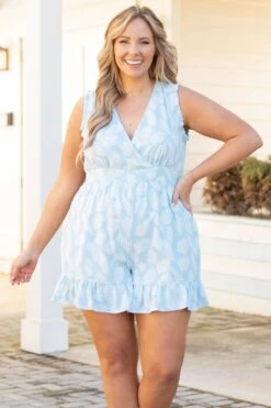 This romper has us tangled up in love! The baby blue color and ruffles along the sleeves and hemline are SUPER chic! The crisscross neckline and flirty fit is perfect for your next night out! Style this romper with some heels and cute accessories for a classy chic look!