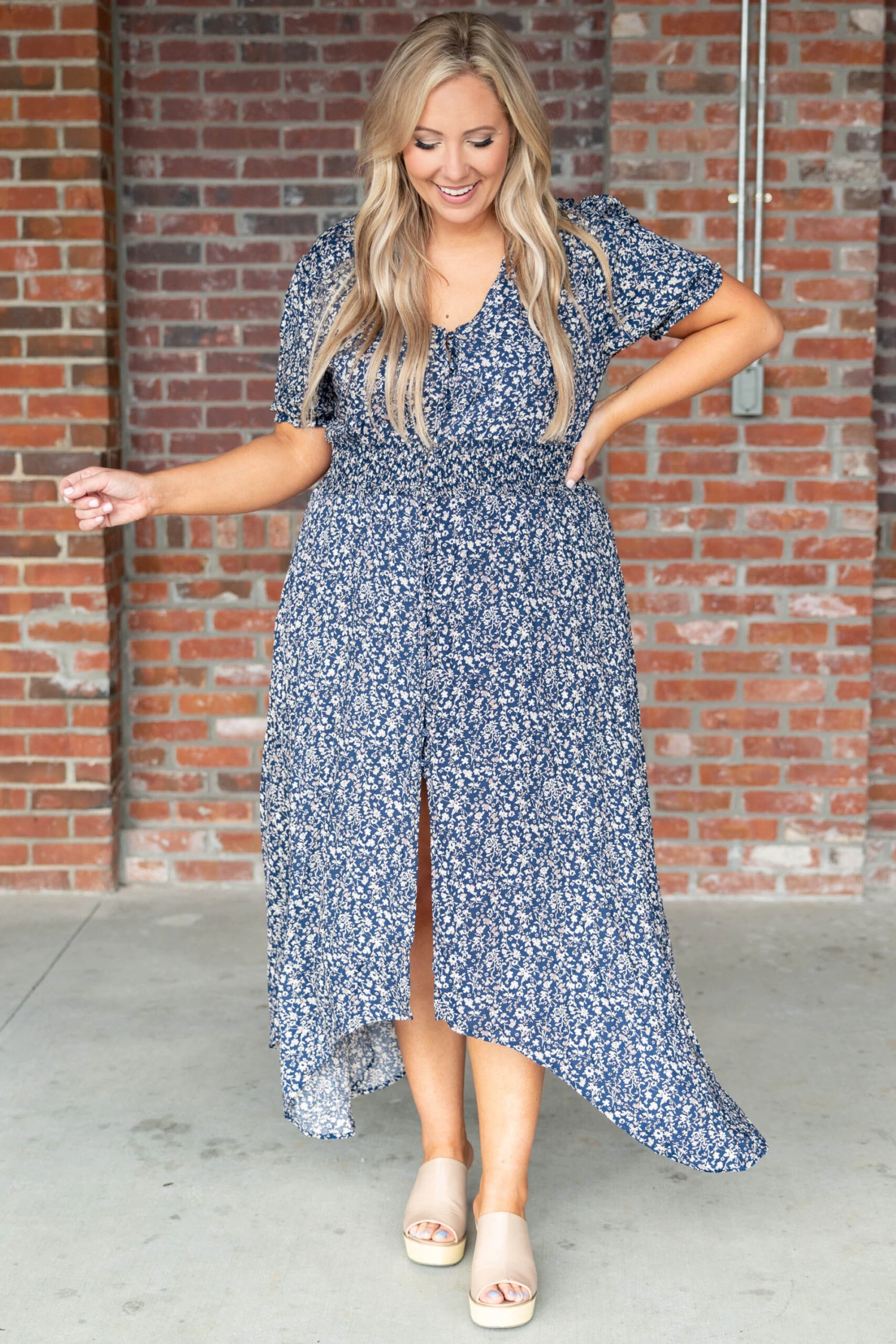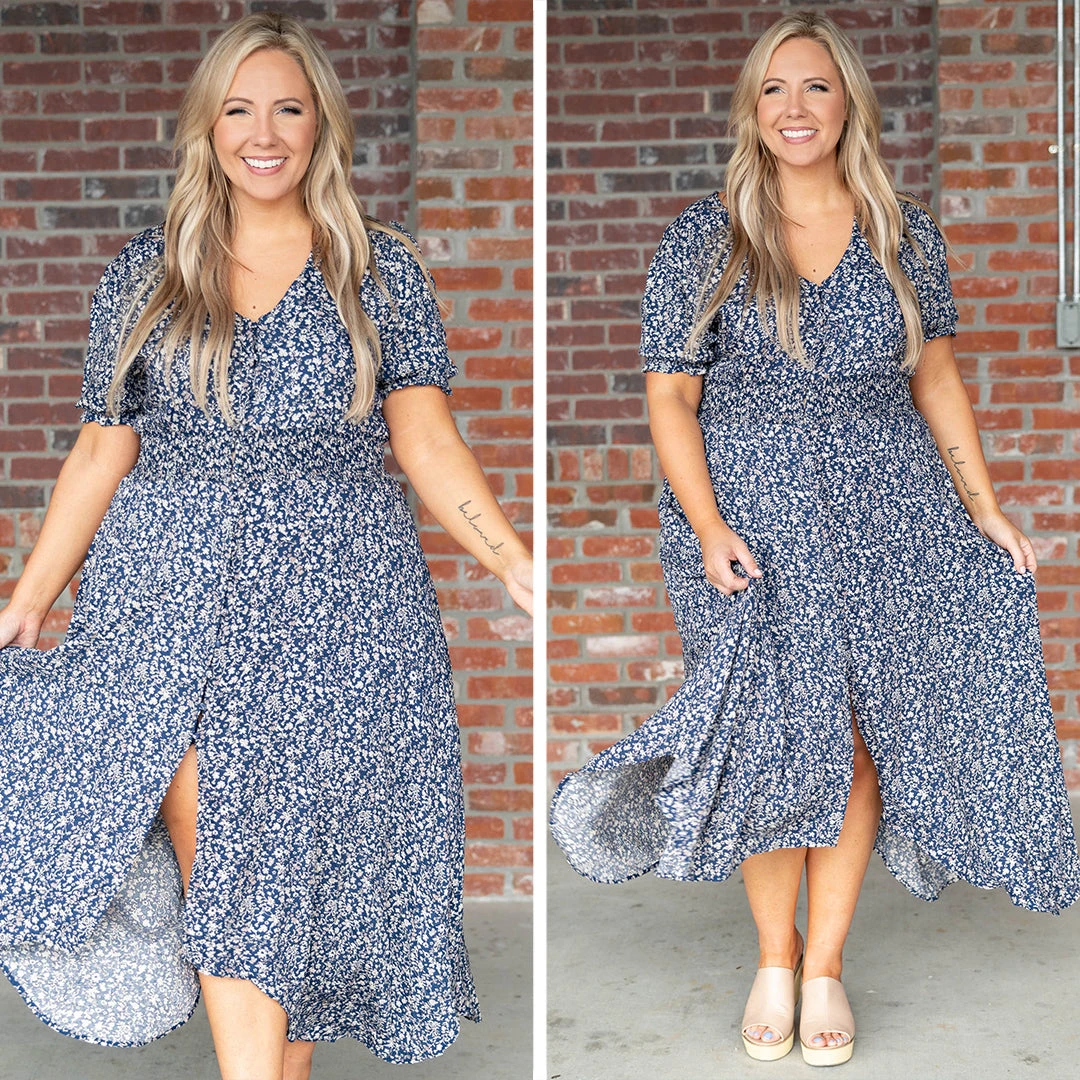 We absolutely love this dress and are so glad you found it! This dress has a pretty floral pattern with a bold navy color that’s perfect for the season! It’s comfortable for all day wear, has a figure-flattering fit, and features a maxi-length for the ultimate look! Pair this dress with sandals or wedges for an effortlessly chic look!Â