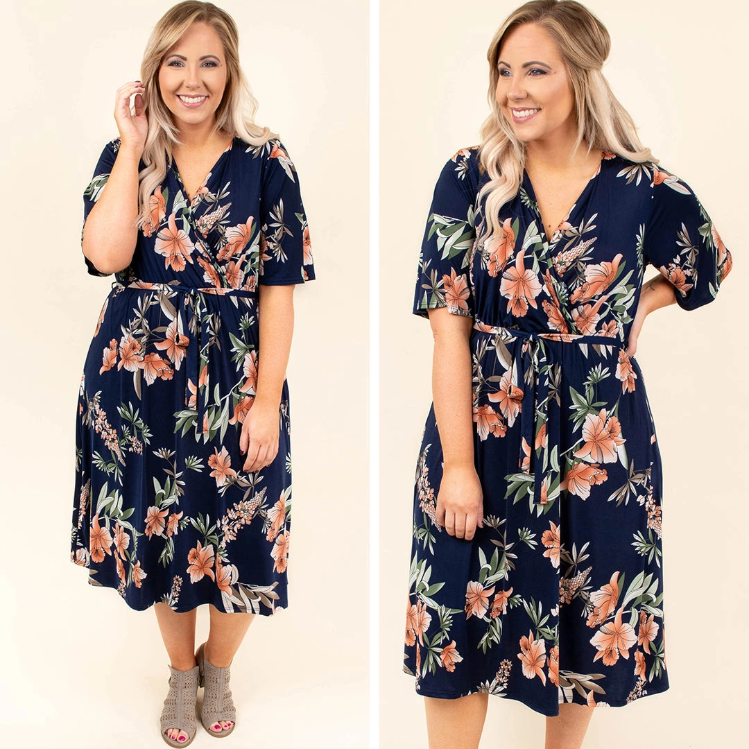 No matter the direction you’re traveling in, this dress is sure to please in every city! It has a beautiful floral pattern for Summer with a chic navy color that can’t be beat! The neckline is too cute and the fit is sure to flatter every figure! Wear it with booties or heels for your next event!