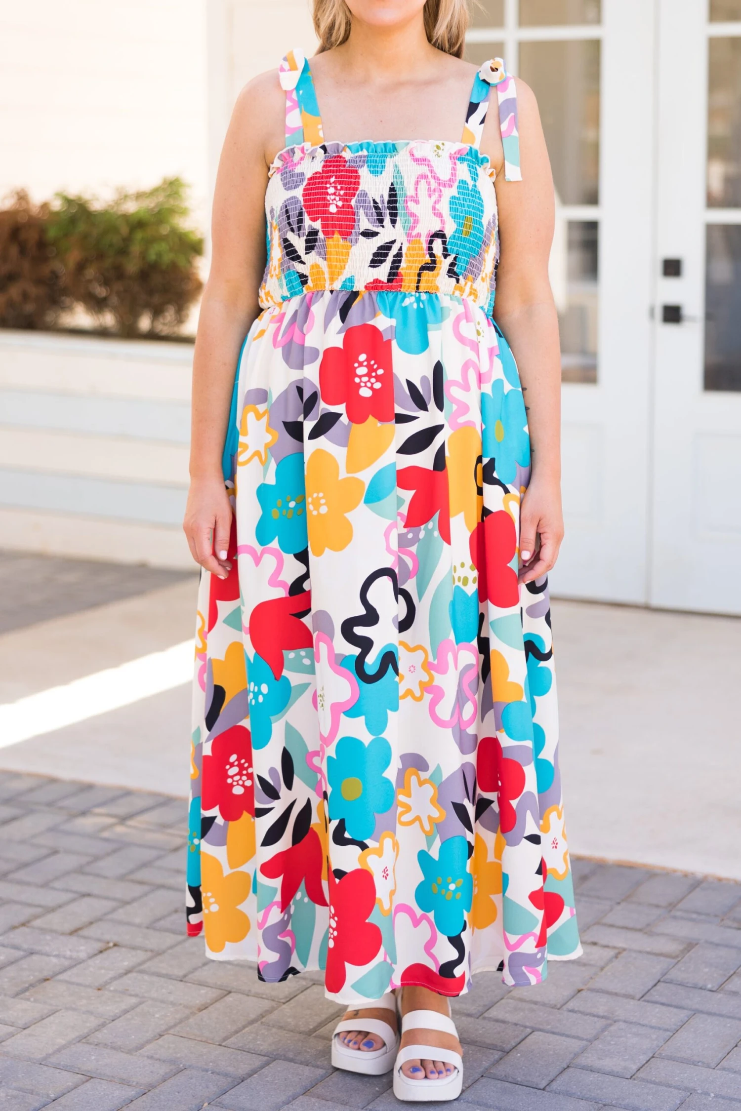 Orange you glad you came across this beauty! The bold color mix is just what you need for the season! The smocked bodice, functional pockets and flowy fit are a great combo for your next event! Style this dress with some platform wedges and cute accessories for a sassy chic look!