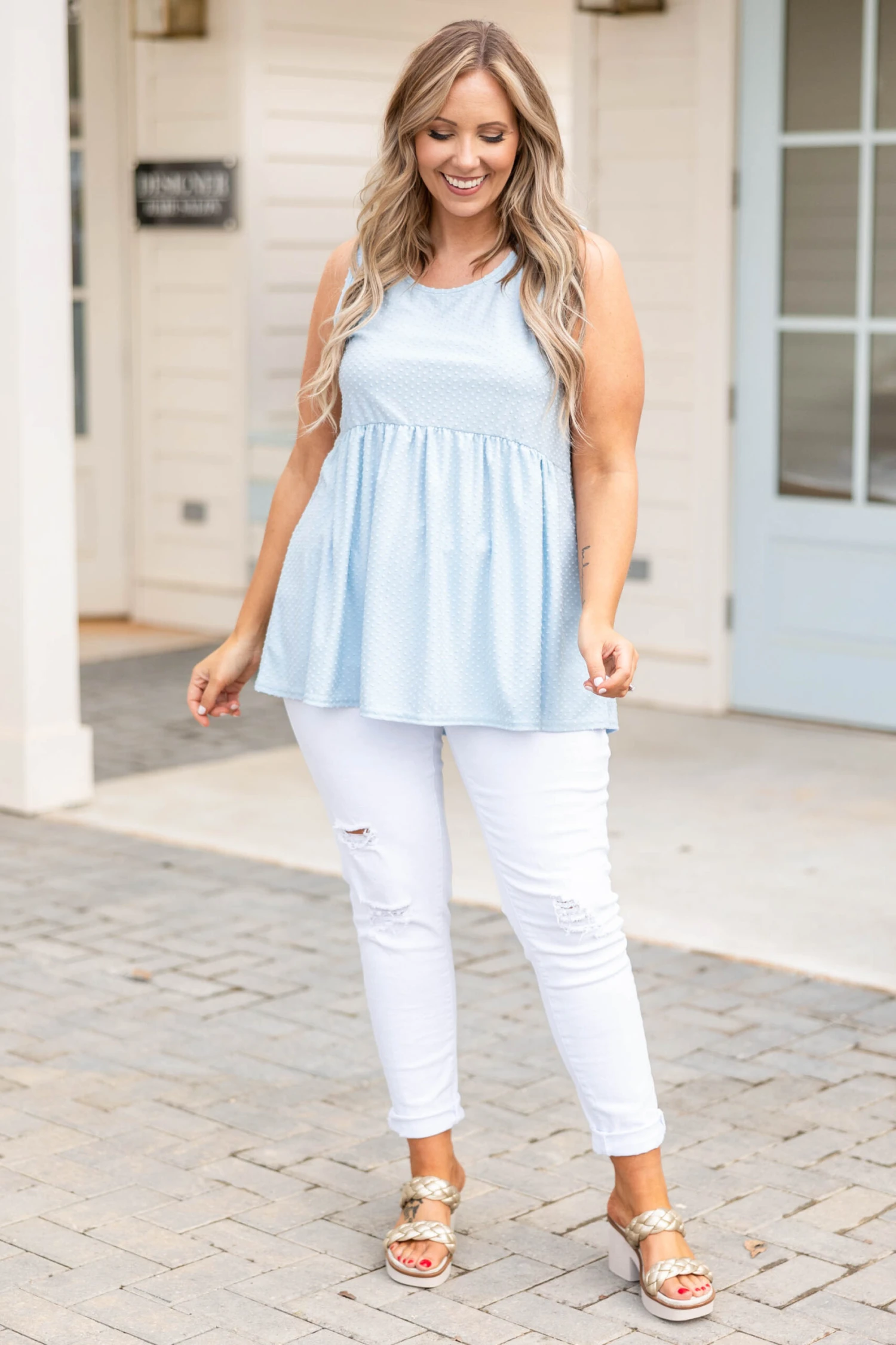 Introducing your new favorite top: The Weekender! Made for wearing beyond the weekend, this tank has a figure-flattering baby-doll fit, a soft fabric to keep you comfortable, and a solid blue color with a trendy French raised dot print easy to pair with everything in your wardrobe! Dress this top up or down and wear it all season long! Pair it with your favorite shoes and accessories for an effortlessly beautiful look you can own in every color!ย