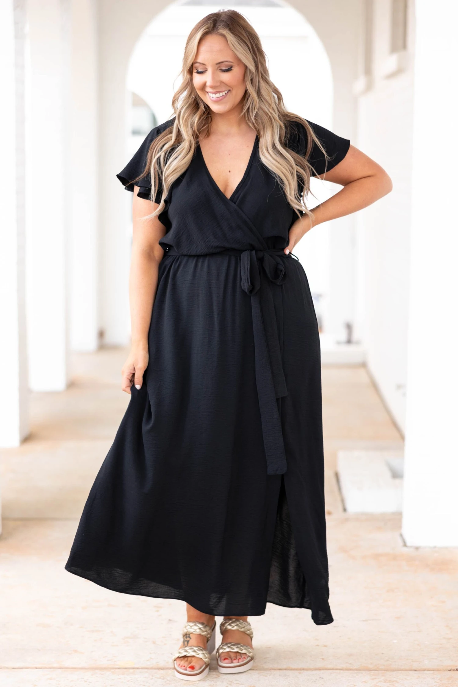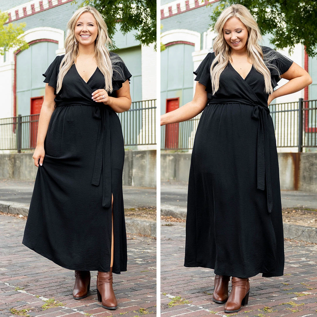 This dress is absolutely STUNNING! The black color is SO beautiful and the crossover neckline is so chic! We love the side slit that gives this dress a flirty, edgy feel and the tie at the waist is so chic! Pair this with some stylish wedges and accessories for a fashion forward look!