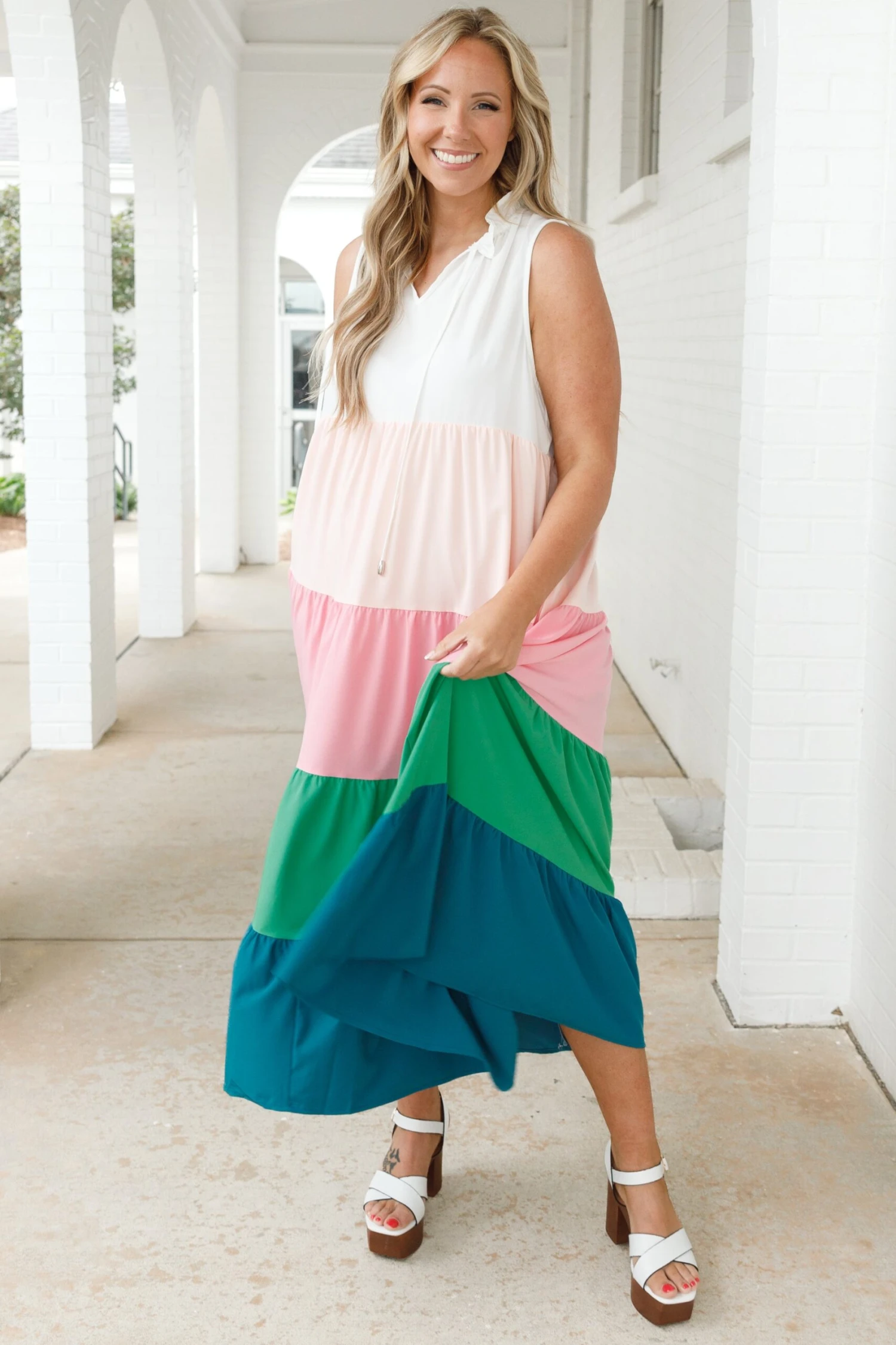 This dress is just your type! Itย is a perfect, breezy and comfortable look for a casual day out! The white colorblock design is highlighted by a flirty ruffles neckline, making it a timeless and stylish piece! The lightweight fabric is perfect for a day on the beach or casual day out!